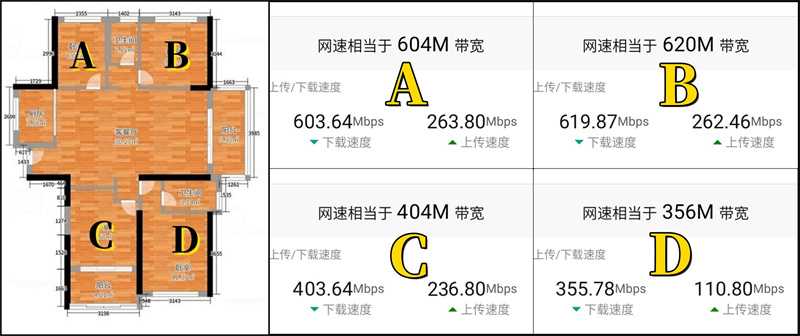 环形布局的家庭格局使得路由器恰好居于中心位置,通过四角踩点发的方式对这些远离路由器的地方进行网络采样测试,根据实际测试得到的数值来看,整体的网络信号覆盖以及网络的传输表现都非常理想,虽然不同节点数值存在差异,但整体用网的流畅性还是有保障的。每个节点测速都能达到300M以上的传输速率,满足运营商工作速率的标准阈值。