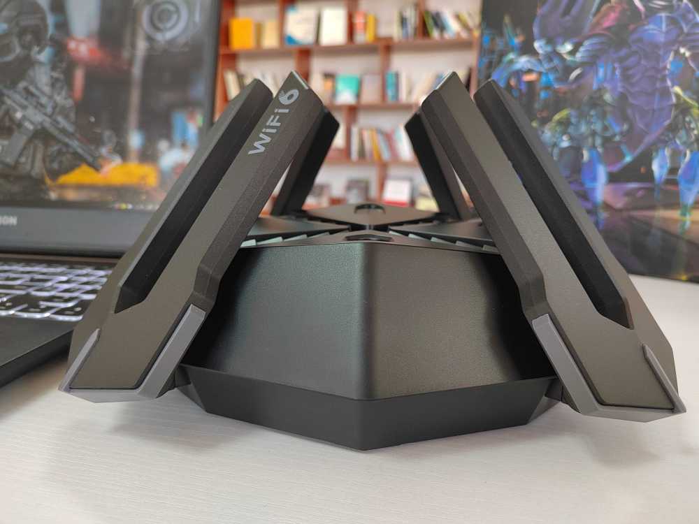 锐捷天蝎电竞路由器做了一个多边形的设计(8边)同时在每条边做了切割工艺,整体看起来非常圆润,天线做了,双频⾼阶4×4射频架构的(8根)增益天线设计,正面的十字分隔,让路由器看起来“肌肉感十足”,摆放在桌面上犹如一个⼋边形战⼠,威风凛凛的在守卫一方疆土。