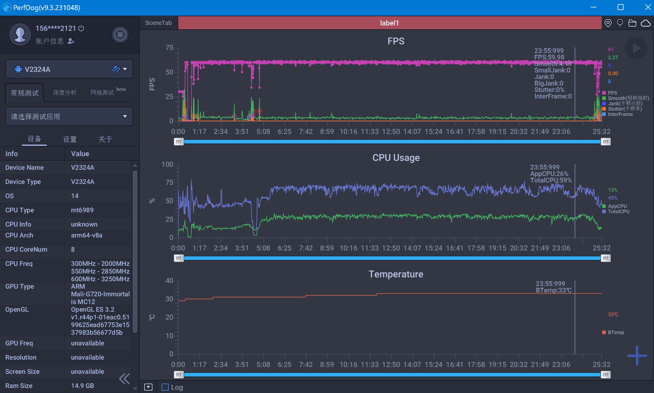 通过性能狗的专项测试和记录,可以看到除了游戏启动时有短暂的帧率和网络波动,常规游戏场景下不光帧率稳定、温控也非常喜人,不夸张地说,连续玩两三个小时后,手机背部都感觉不到明显的温热!