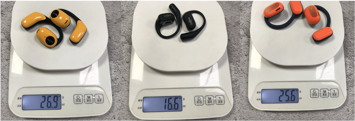 三款耳机拿到手的重量感都有不一样的感觉,韶音是比另外两款轻许多,但是重量轻也不是一定会佩戴舒适,韶音在我戴的感觉是轻但不稳,可能是重量不够,然后耳朵大小不够,在轻微运动的情况下容易晃动,南卡和Oladance差不多的重量,相差1g,不过佩戴起来的感觉不是很一样,南卡的13g的压感很弱,南卡OE Pro在接触皮肤的地方主要采用的是医疗级液体硅胶,所以它的手感摸上去要比其他两款要柔顺舒适,加上31度的支撑受力设计,也不容易滑动,所以存在感基本没有,Oladance OWS 2也有硅胶覆盖,但是感觉没什么辅助作用,很容易滑动,还不如韶音,虽然和南卡的结构乍一看很像,但是南卡的细微设计还是带来很不一样的感觉。