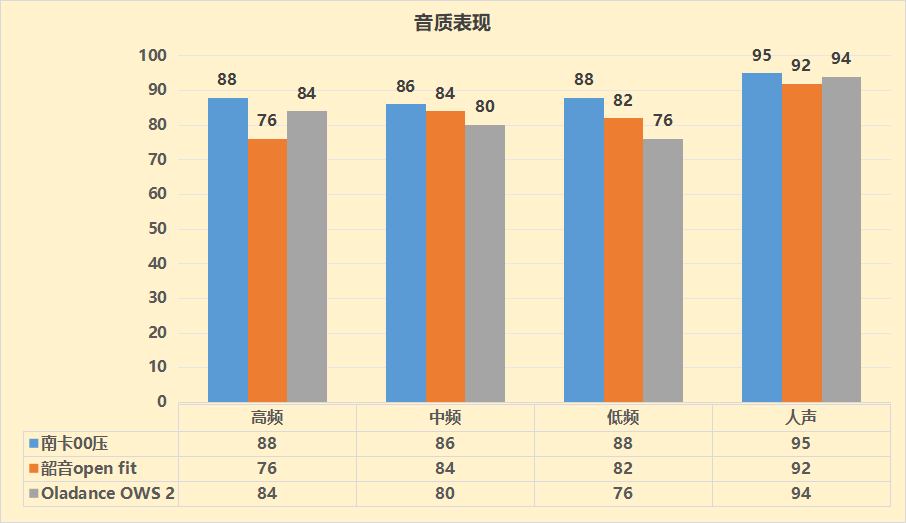 总的来说,从低、中、高三频表现以及人声和声场表现来看,其实这三款南卡的听感呈现细节还是比较丰富的,很细腻。Oladance 会有清晰度不高、量度不足等问题,还有韶音就是低、中、高频,更多是偏向性,没有很均衡,不过日常听听歌也还很不错的。