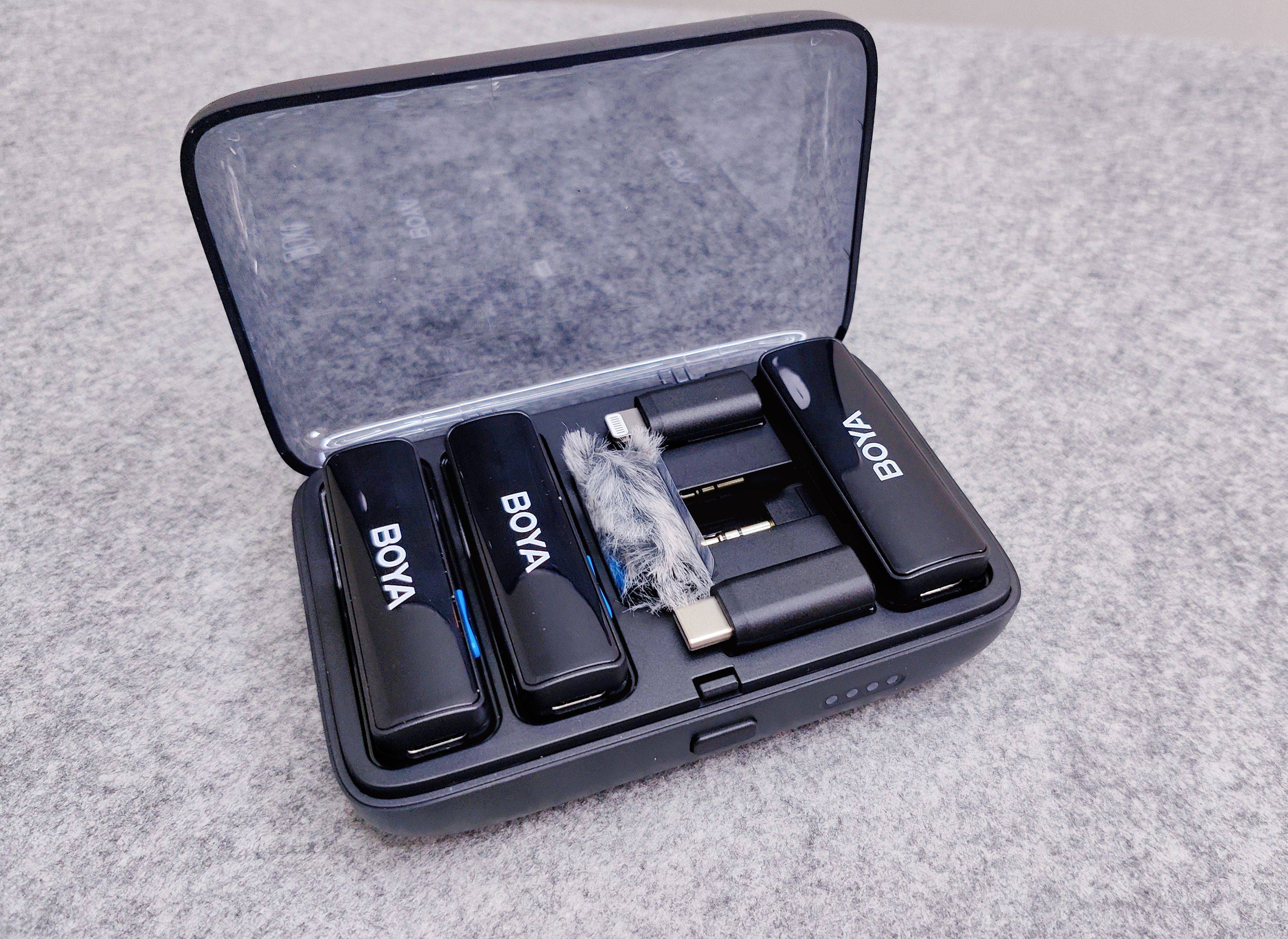 除了耐用性外,续航也是领夹麦克风必不可少的考虑因素,BOYA小黑盒一次充满可以提供10个小时左右的续航,而且充电盒可以提供30个小时的超长续航,而且使用时支持苹果闪电接口、USB-C 接口的设备,直播时还可以为同步设备充电,边充边用不再担忧设备断电被迫下线,还有MFI官方认证。某多多麦克风续航方面逊色于BOYA小黑盒。