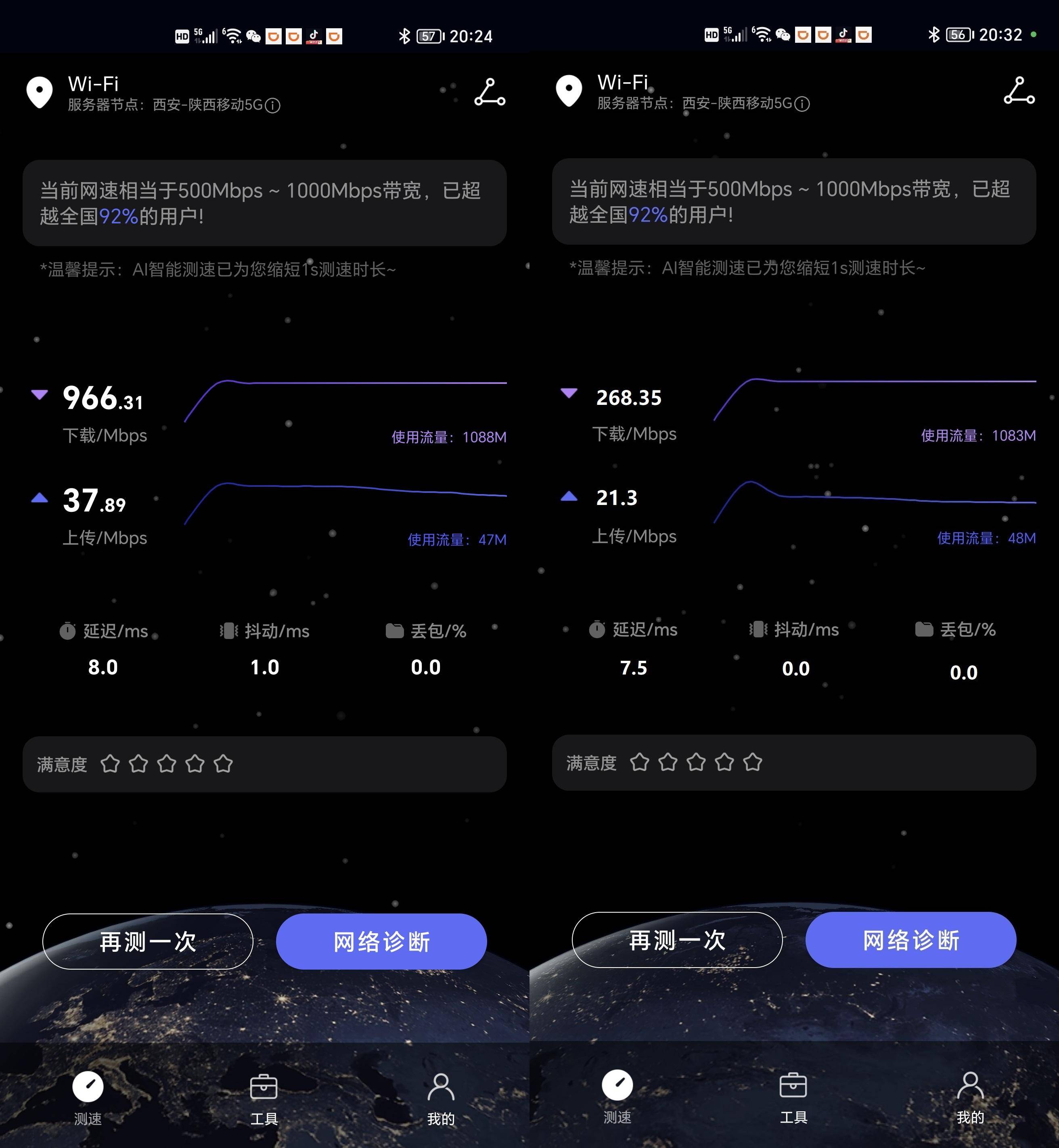 锐捷黑豹的网络速度表现真是令人印象深刻!即使在距离路由器隔着7米的一堵墙后,使用花瓣测速测试下载速度依然能够高达966.31Mbps,而在两堵承重墙的情况下,下载速度依然达到268.35Mbp,这个数据不仅仅是迅猛的速度体现,更是对稳定性的极佳保证。