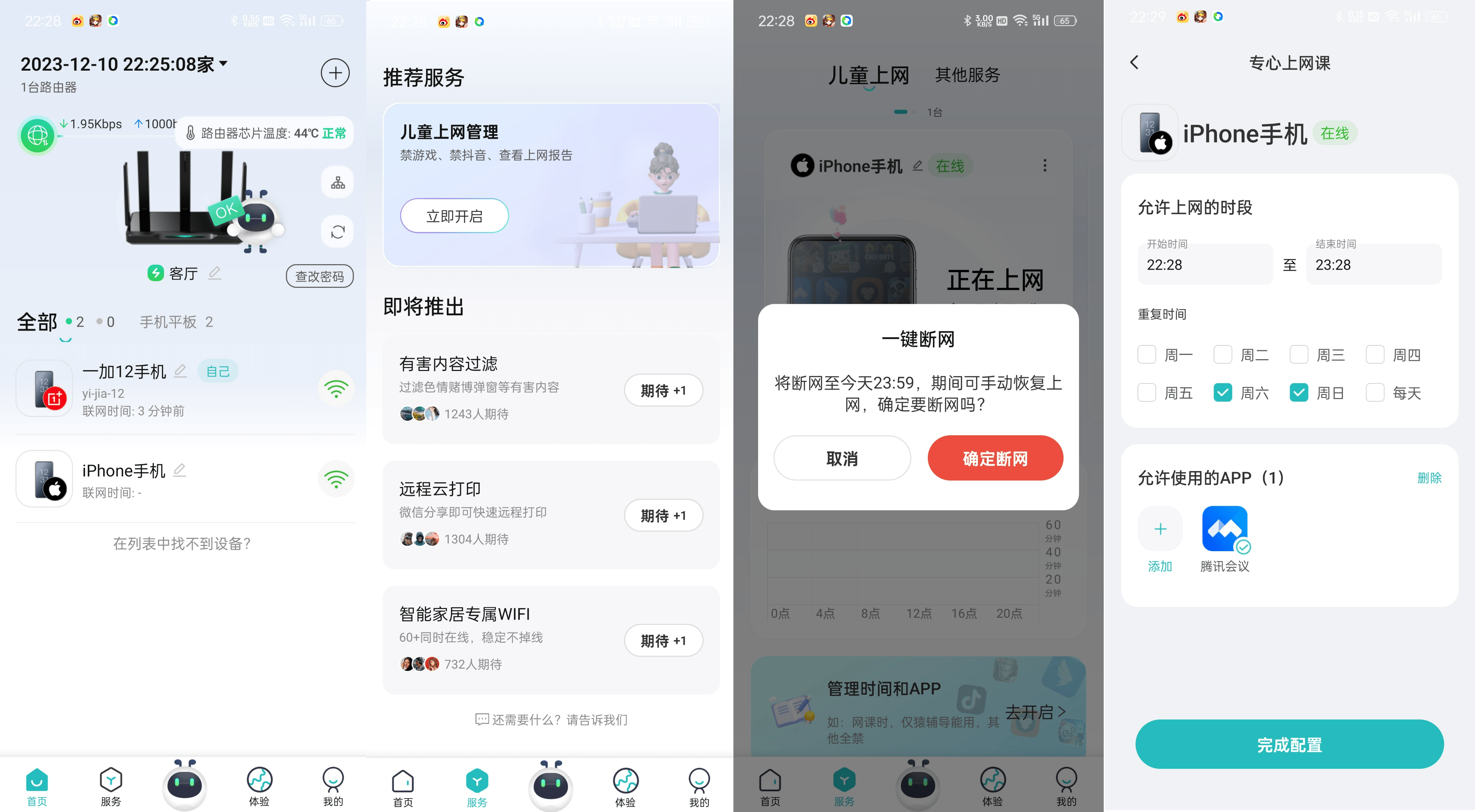 特别是升级后的儿童上网管理功能,可以一键立即断网默认到当天23点59,也可以设置允许上网的时间段以及循环的周期,还支持234种App进行更精准的App的联网,随时控制孩子的上网行为,为家长提供了更多的掌控权,为小朋友学习创造一个健康的网络环境。