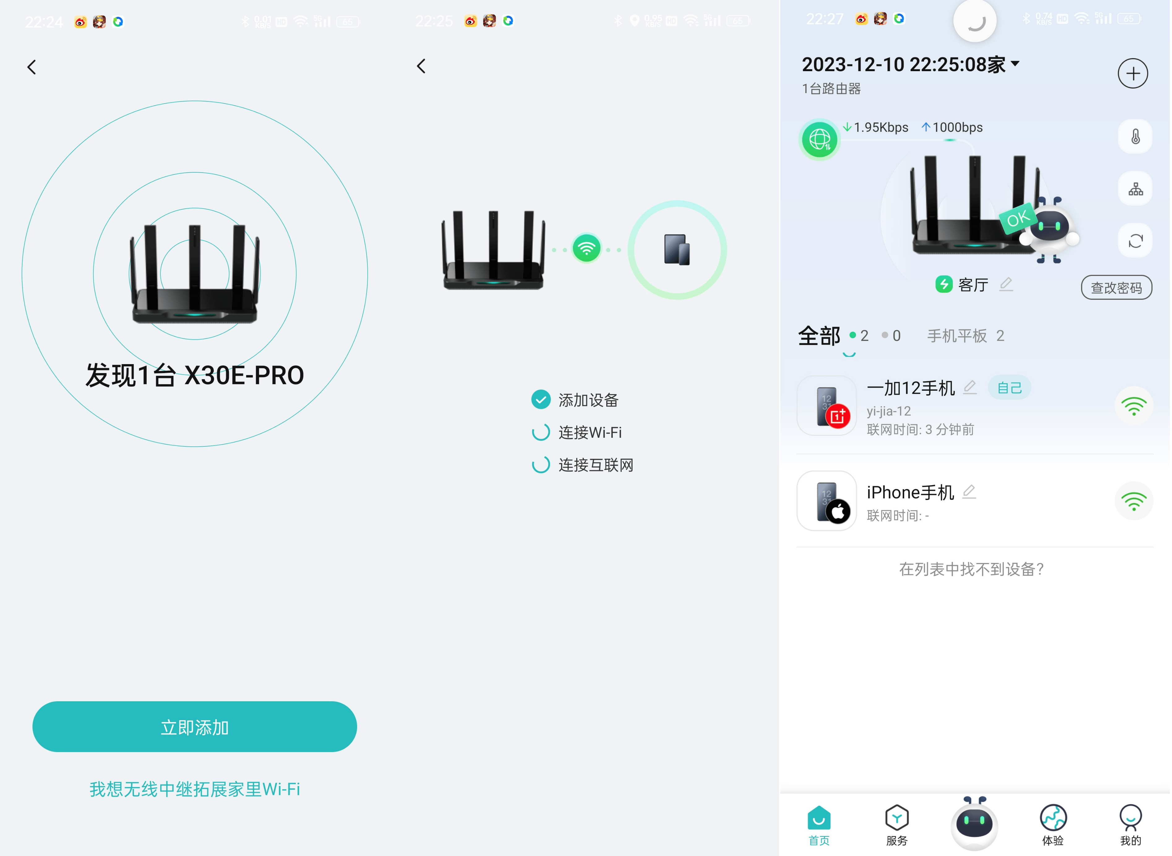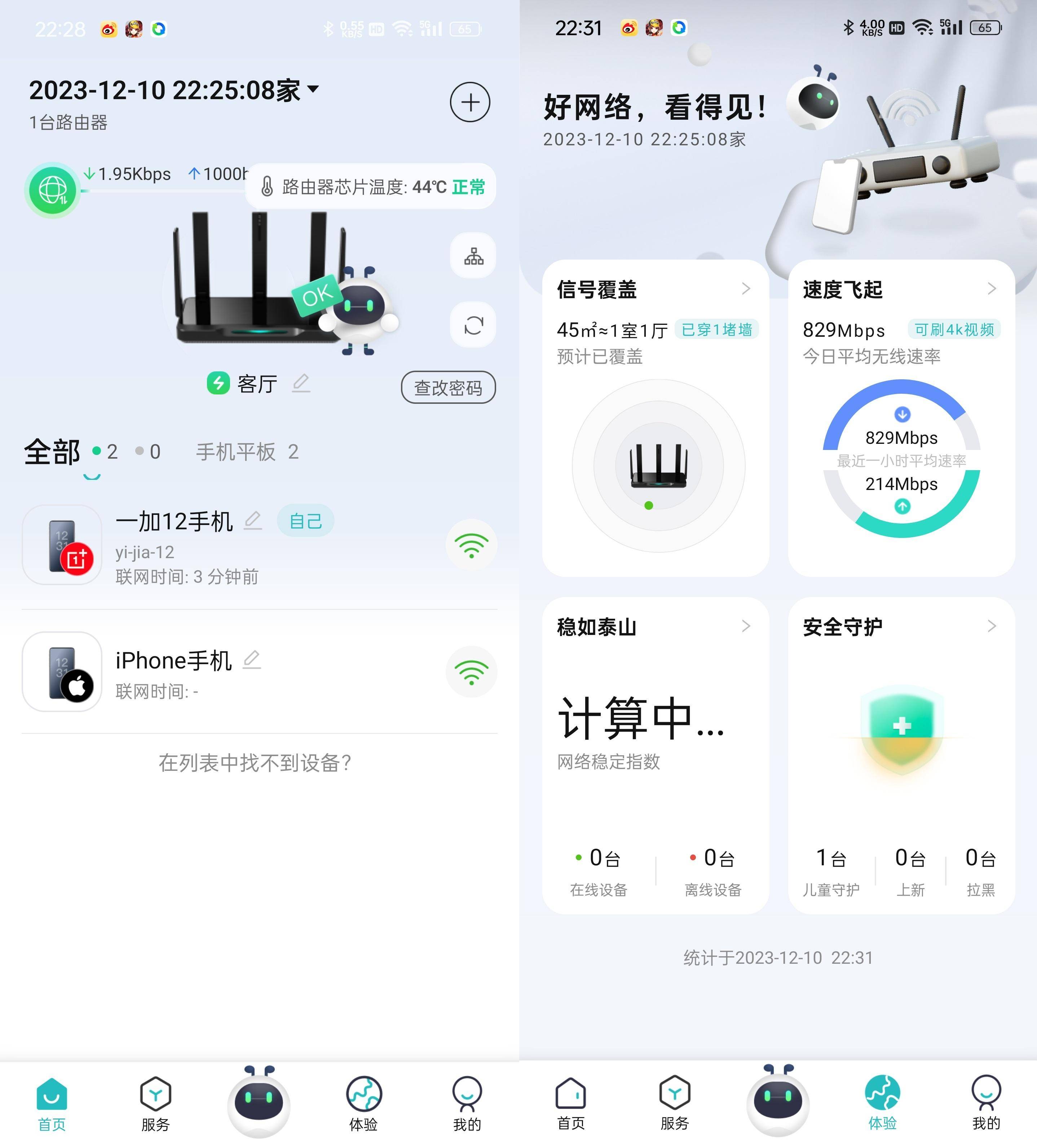 首页可以查看连接设备和设备温度,升级款app带来的终端自动识别功能真的很棒,一眼看上去连接设备列表展示的连接设备名称和品牌显示的一清二楚,就连联网时间都能看到,可以轻松管理对各个联网设备进行管理。 全新的体验页面可以很直白的看到家里WiFi信号的覆盖范围,以及平均的上传下载速度,这种可视化展示对于家里联网情况一览无余。