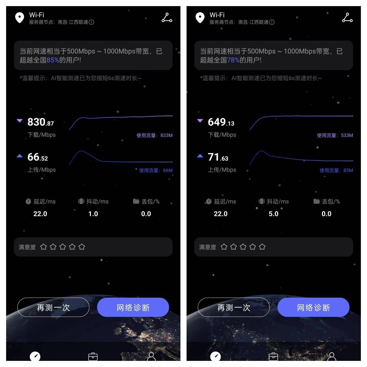 接下来我们来看看与客厅间隔2堵墙的主卧以及与客厅间隔3堵墙的书房,它们的网速测试表现。可以看到间隔2堵墙,Wi-Fi信号依旧满格,下载速度还能达到830.87/Mbps,上传速度也有66.52/Mbps,延迟低至22ms;而间隔3堵墙后,下载速度则为649.13/Mbps,上传也有71.63/Mbps,依旧能维持住满格的Wi-Fi信号,说实话还挺令人惊喜的。不难看出,锐捷黑豹电竞路由的信号穿透力很强,而网速表现也超出预期,表现比我预想中还要好。
