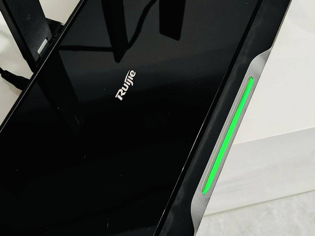 锐捷黑豹电竞路由的机身看起来要比同价位其他路由器更加轻薄,正面还设计有一个长条形的状态指示灯,看起来更直观、大气,能够更加方便的了解到路由器当前的工作状态。能够感觉到锐捷在这款黑豹电竞路由的外观设计上是花了心思的,不是跟市场上其他路由那样千篇一律的外观,还是有着属于自己特色的。