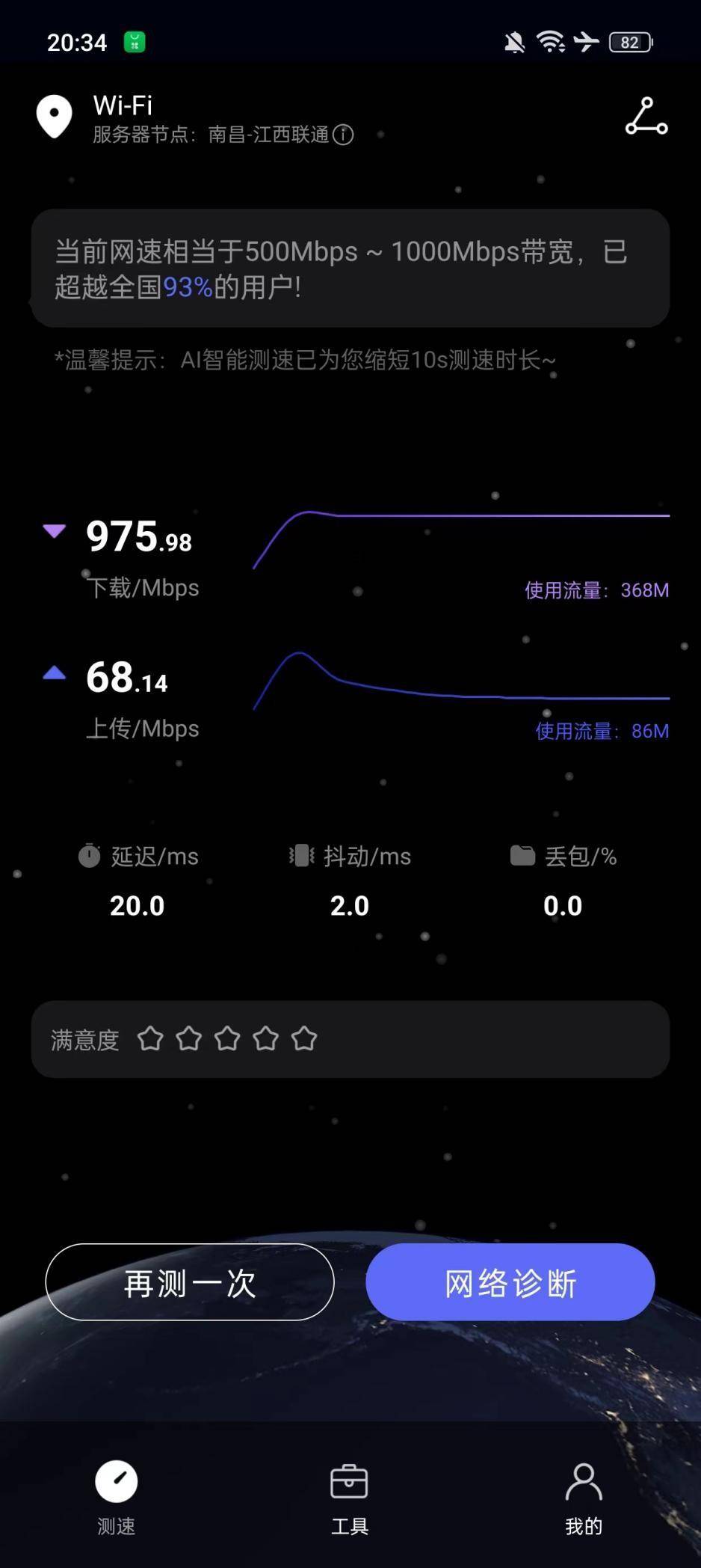 当然了,实际的网络体验如何,才是决定一款路由器是否成功的关键。我现在住的是房子有125平方米左右,安装的宽带是联通的千兆光纤网络,路由器放在客厅电视柜上。在网络信号最强的客厅中测试网速,可以看到下载速度为975.98/Mbps,上传速度为68.14/Mbps,延迟低至20ms,这个表现可以说是相当不错了。不过毕竟是在网络信号最强的客厅位置,能有出色的表现倒也算是情理之中。