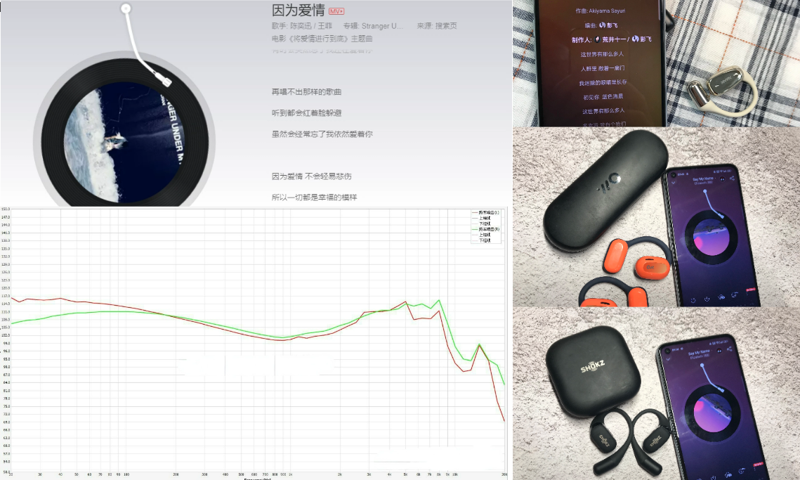 韶音openfit:我试听了《因为爱情》,该音乐中频乐器与人声较为丰富,尤其是歌手的声音甜美、空灵,具有十足的通透感。OpenFit在这首音乐中表现较好,人声不错,没有损失太多声音能量,穿透力与声场还原都较为到位。