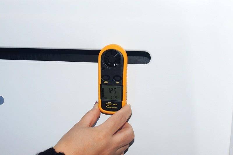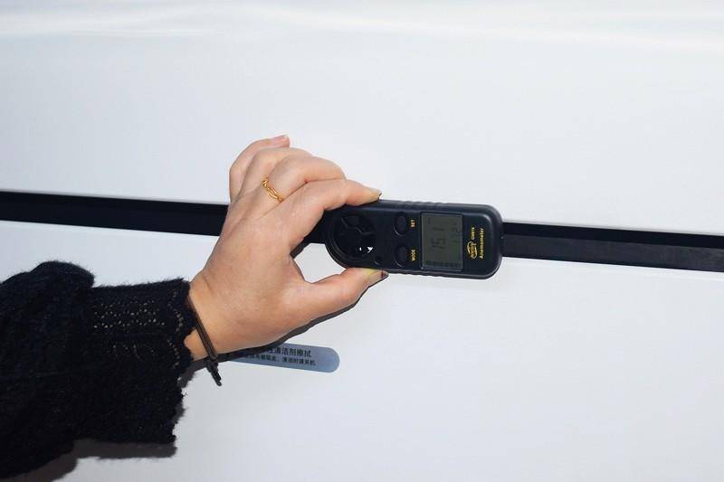 实际测试下,这是打开二挡抽风的风速:12.5m/s。可以看其吸力很大。