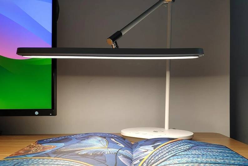 这款台灯的灯杆是阳极氧化工艺铝合金,拥有冰霜银质感,细腻精致的冰霜银工艺细节随光而动,质感高级材质将科技与美学结合起来,将纯粹变成一种风格。这款台灯拥有四千万导光点,独创微导光结构,从普通导光板六万颗激光雕刻导光点,升级为四千万颗微米级导光点,精密计算每束光的路径,光照面积和均匀度大幅提升。
