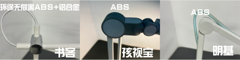 材质的好坏不仅在手感、感观上的体验不一样,对于台灯的使用寿命来说也是有着极大的影响的,一些比较廉价的原材料使用不久就容易坏。这里我们主要看转轴处的材质,因为平时使用时经常需要转动,在整个台灯结构中也是比较重要的方面,通过外观我们可以看到每款产品转轴处的材质都是不同的。