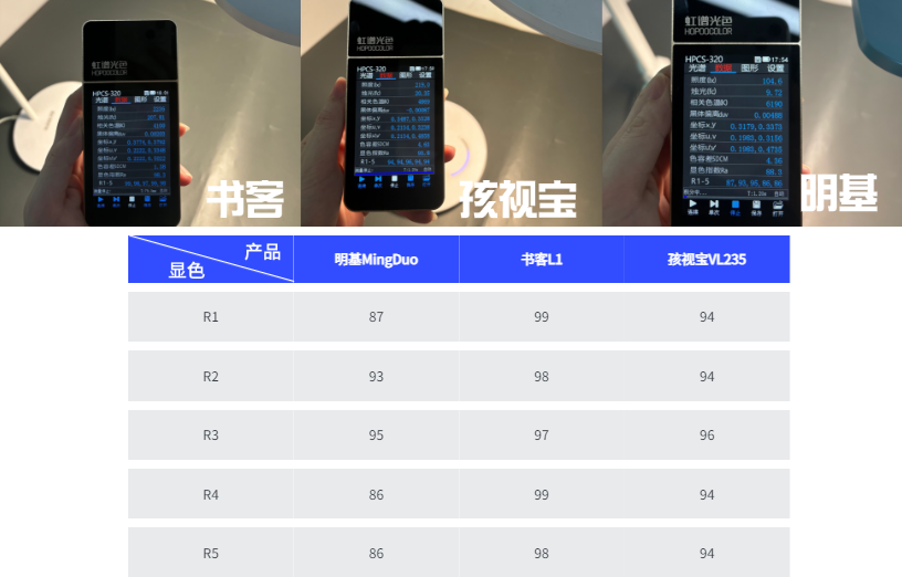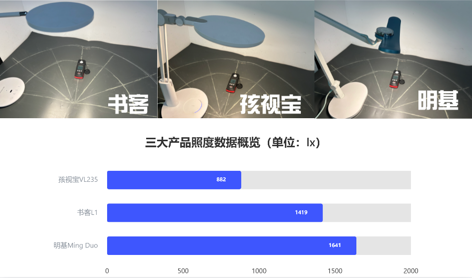 相比之下,明基MingDuo和孩视宝VL235的照度稍显较低,不过仍符合《读写作业性能要求》的规定。
