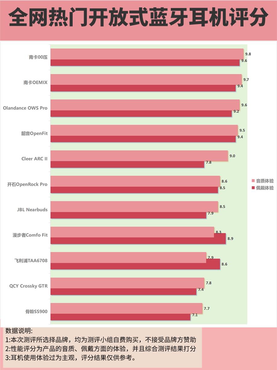 开放式耳机作为热门蓝牙耳机类型,越来越多人开始使用。市面上开放式耳机品牌越来越多,功能的完善程度更快,最近几天浏览了开放式耳机页面和相关话题,发现有很多网友提问问题,导致一部分用户不知道开放式耳机该如何选购了。面对大家常问的问题,提出的疑问,所以此次,我来给大家推出一期关于开放式耳机的推荐文章。下面我还给大家整理了一份全网热销开放式耳机的一些评分表,大家有兴趣可以一起结合参考一下