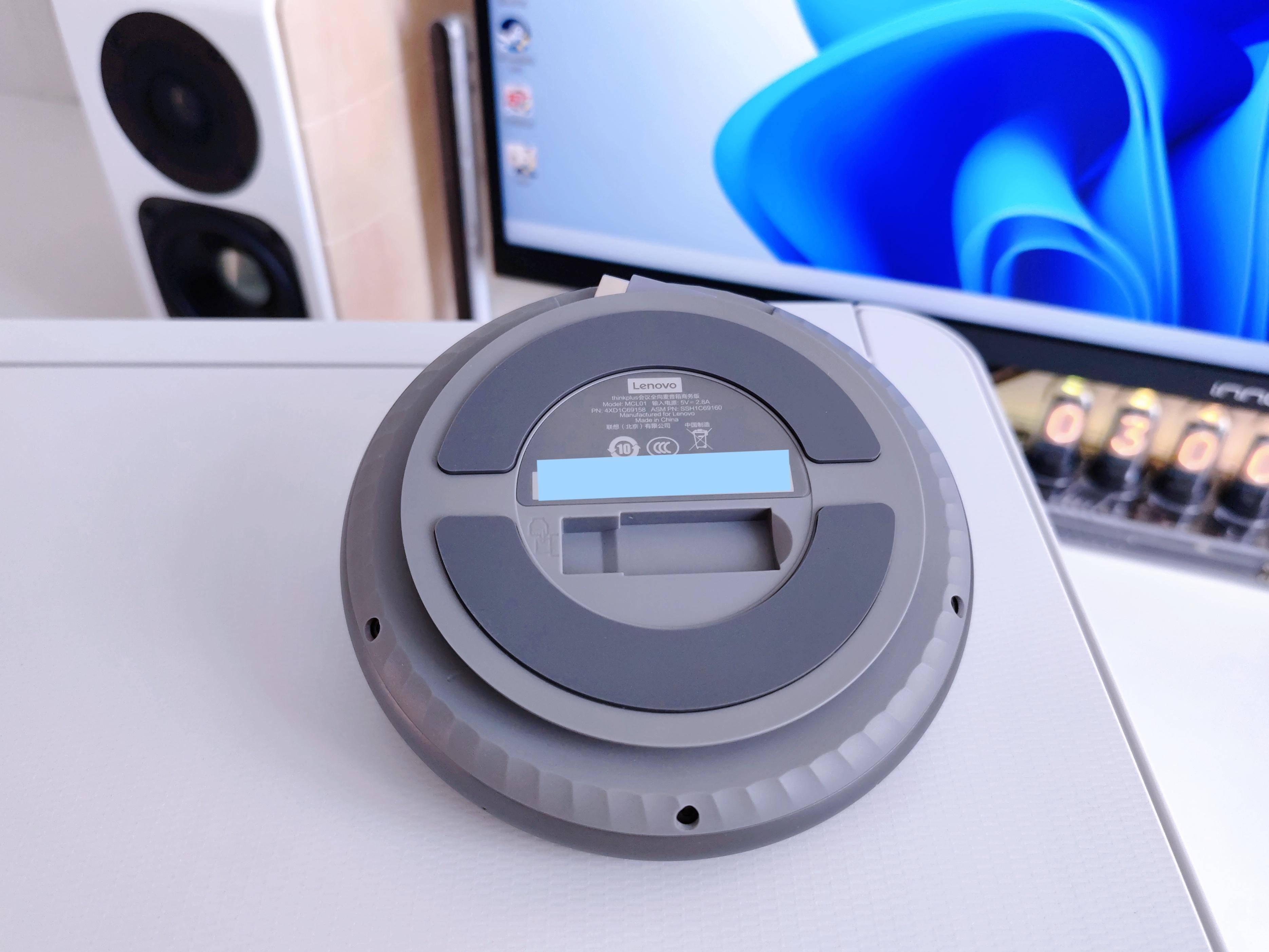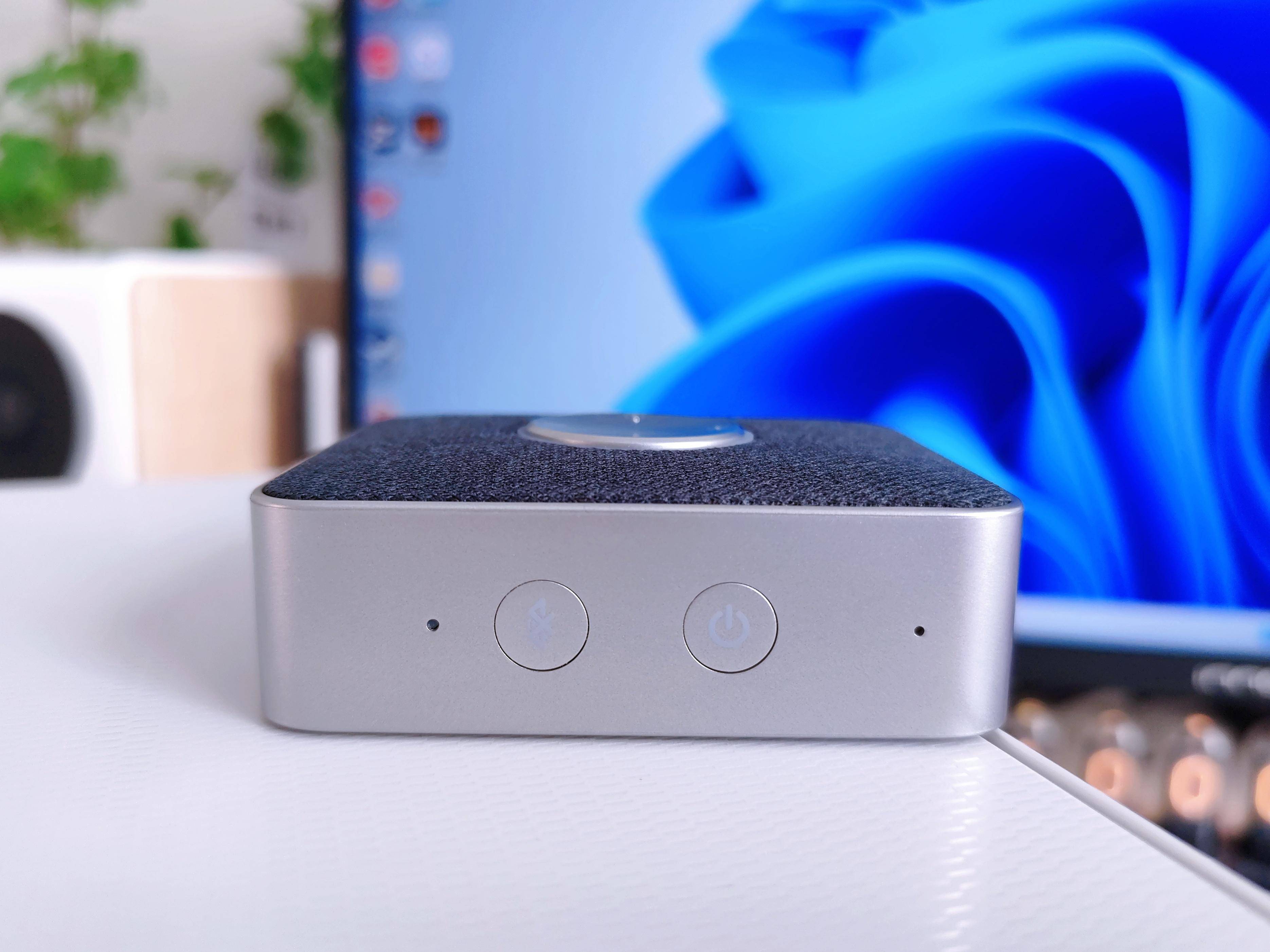 此音箱采用圆形设计,外形尺寸φ132*35cm,268g整机重量,沉稳内敛;多重工艺锻造通体银灰色的外观,铝合金材质机身,呈现金属质感,有效保护内部元器件。顶部设有通话/静音键、音量±键和智能T键,创新采用按键投影的方式,实时了解是否静音、音量和会记状态,贴心交互设计,带来便捷的体验。而底部隐蔽收纳数据线,设置了两条半环型防滑硅胶垫。整体看上去商务气息比较浓郁。
