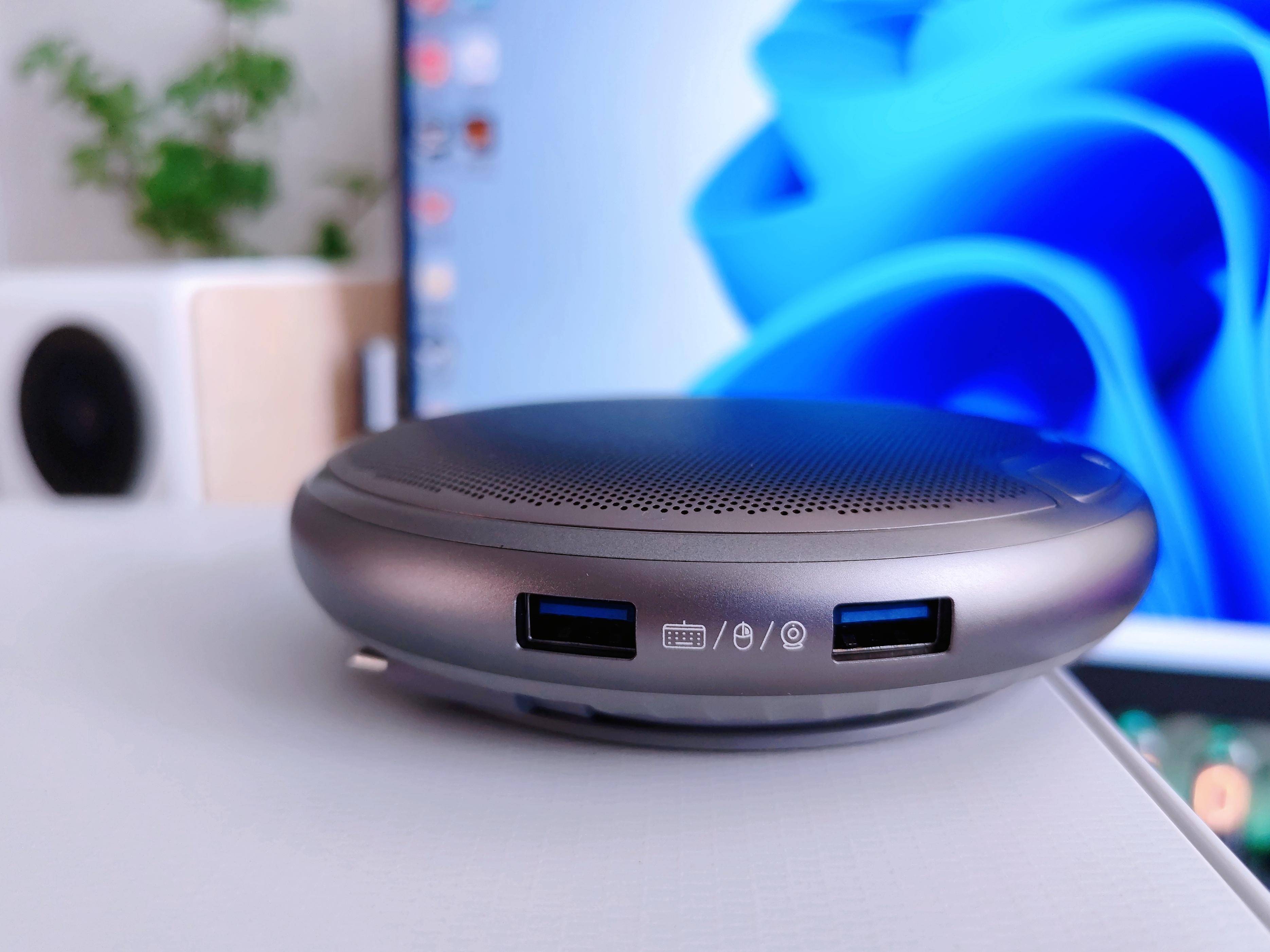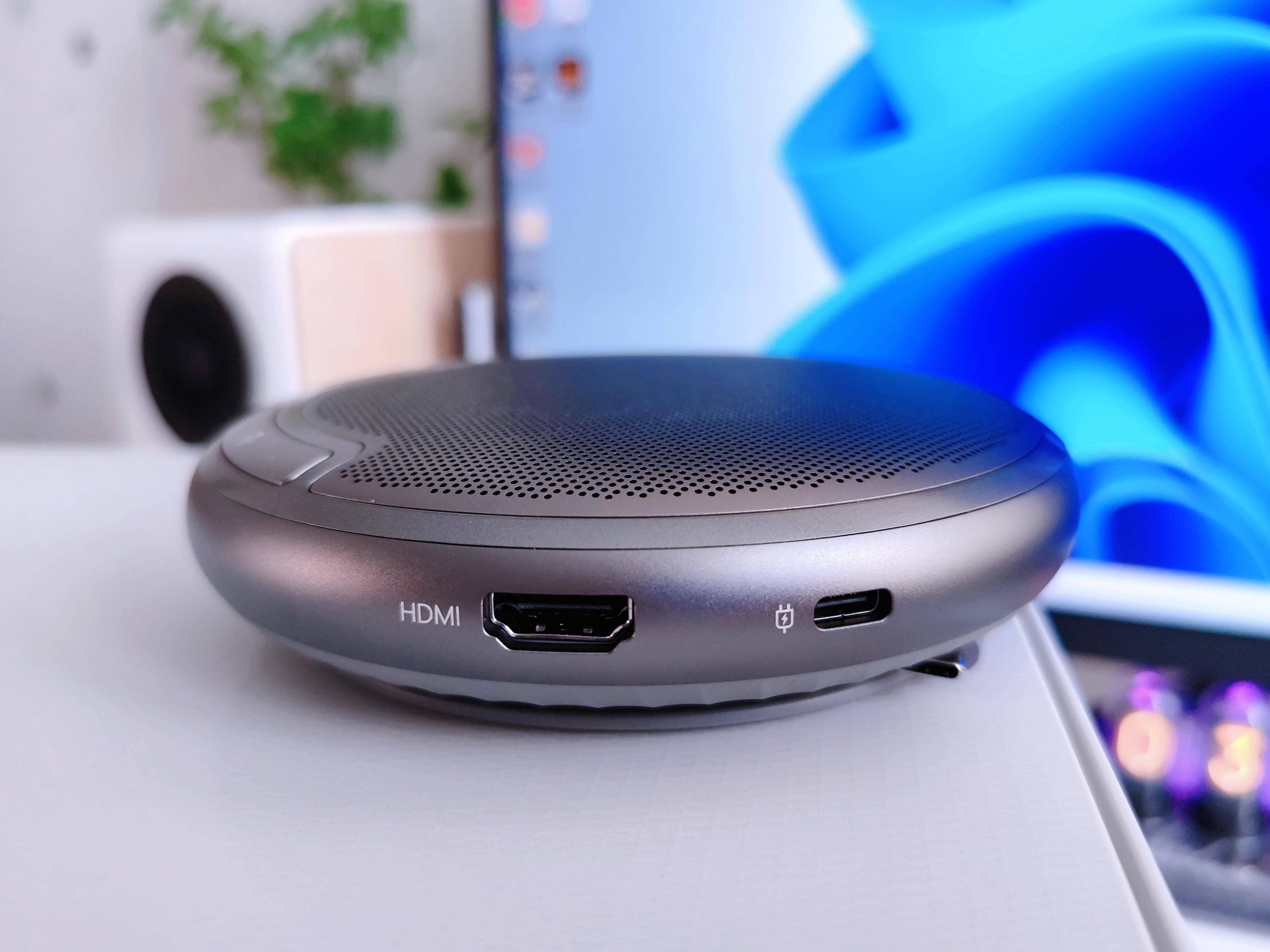 此音箱侧面设有麦克风*2、USB-A接口*2、USB-C全功能接口和HDMI接口。USB-A接口支持10Gbps数据传输,可以连接鼠标、键盘和摄像头等。USB-C全功能接口支持90W供电和10Gbps数据传输,可为笔记本反向供电。HDMI接口支持4K60Hz,可以连接显示器和投影等进行高清传输。这些接口可以完全实现扩展坞功能。