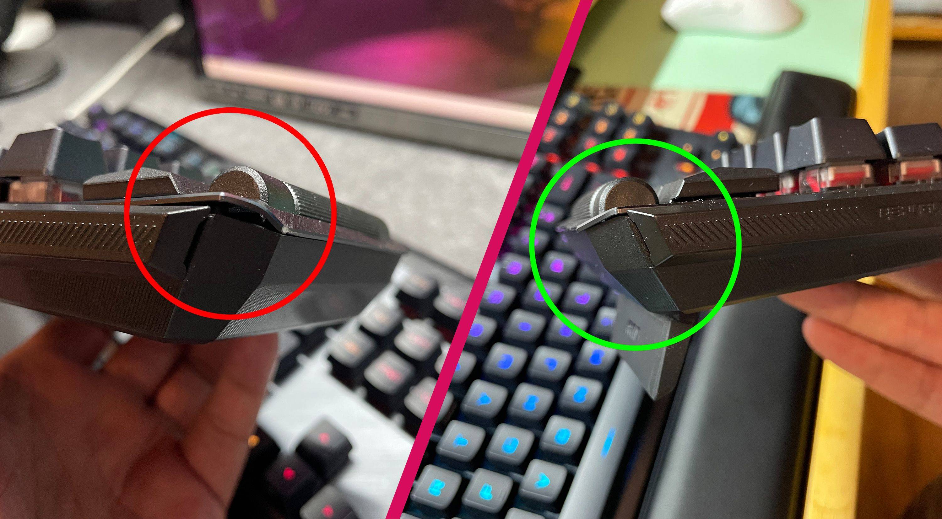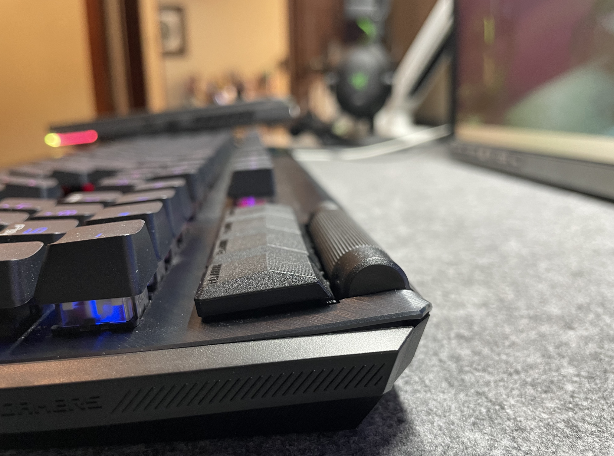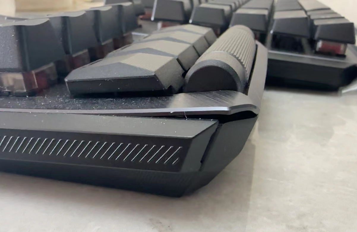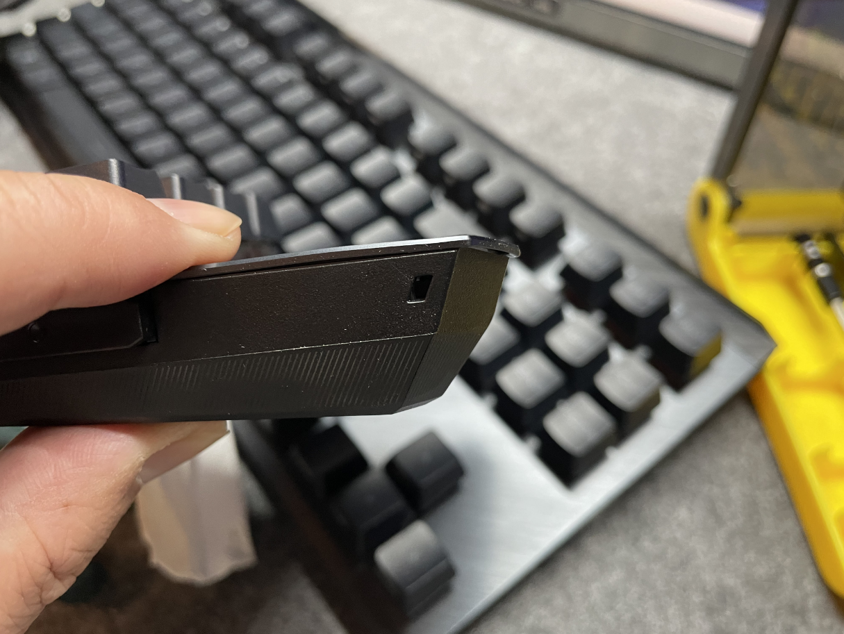 这个时候这不算翻车,因为这是我们购买的时候就知道的信息。但是下面就算翻车了。首先这个滚轮,轻轻一摁会下去,就会和上面的金属边框卡住不能滚动。用指甲稍微抠起来点又能往下滚,但是往上滚一使劲又卡住了。这是个音量控制滚轮,我雷蛇黑寡妇键盘上也有,比点windows小喇叭方便的多。所以这个键是我的常用键。▼▼▼