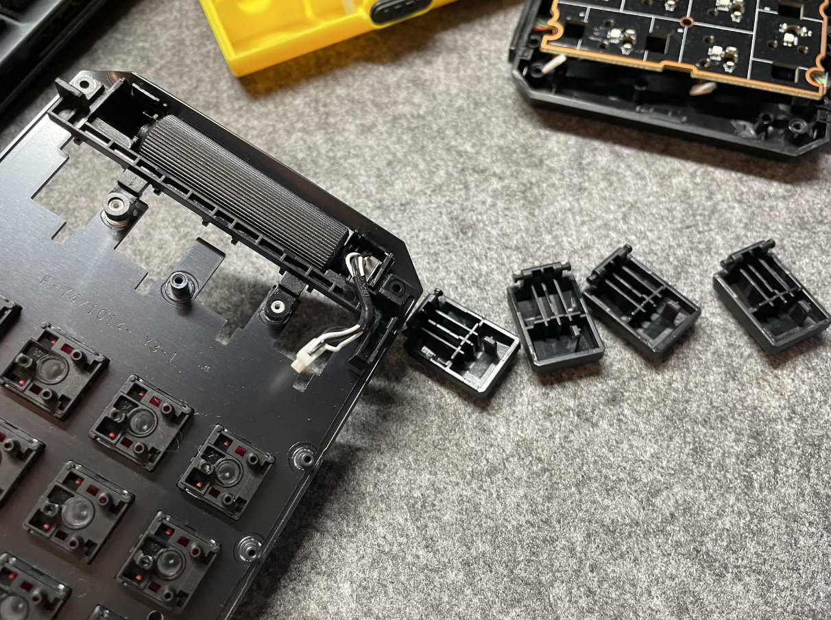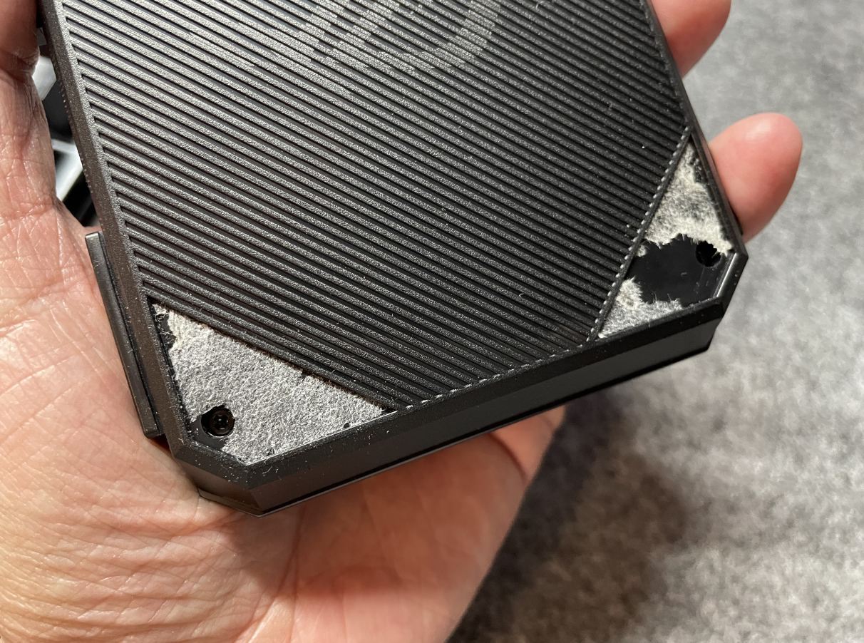 比划半天上面拆开了,下面拆不了,我怀疑橡胶脚垫有俩螺丝。这时候不专业的我没用吹风机,下次一定。拿开脚垫果然有俩螺丝。▼▼▼