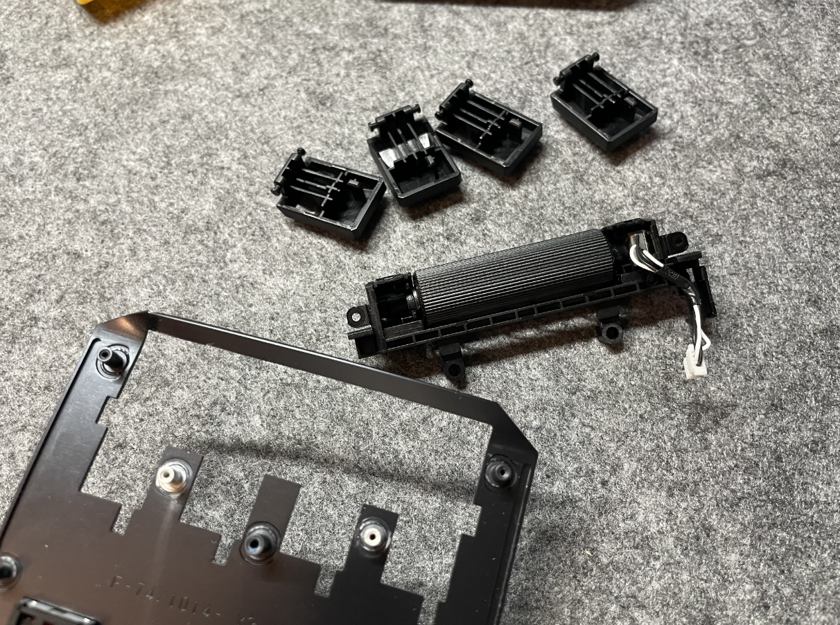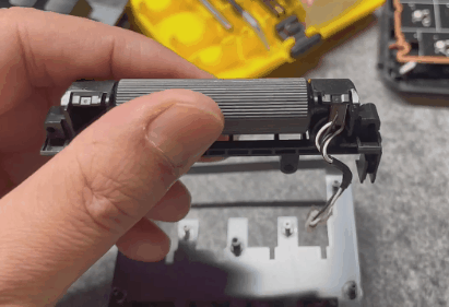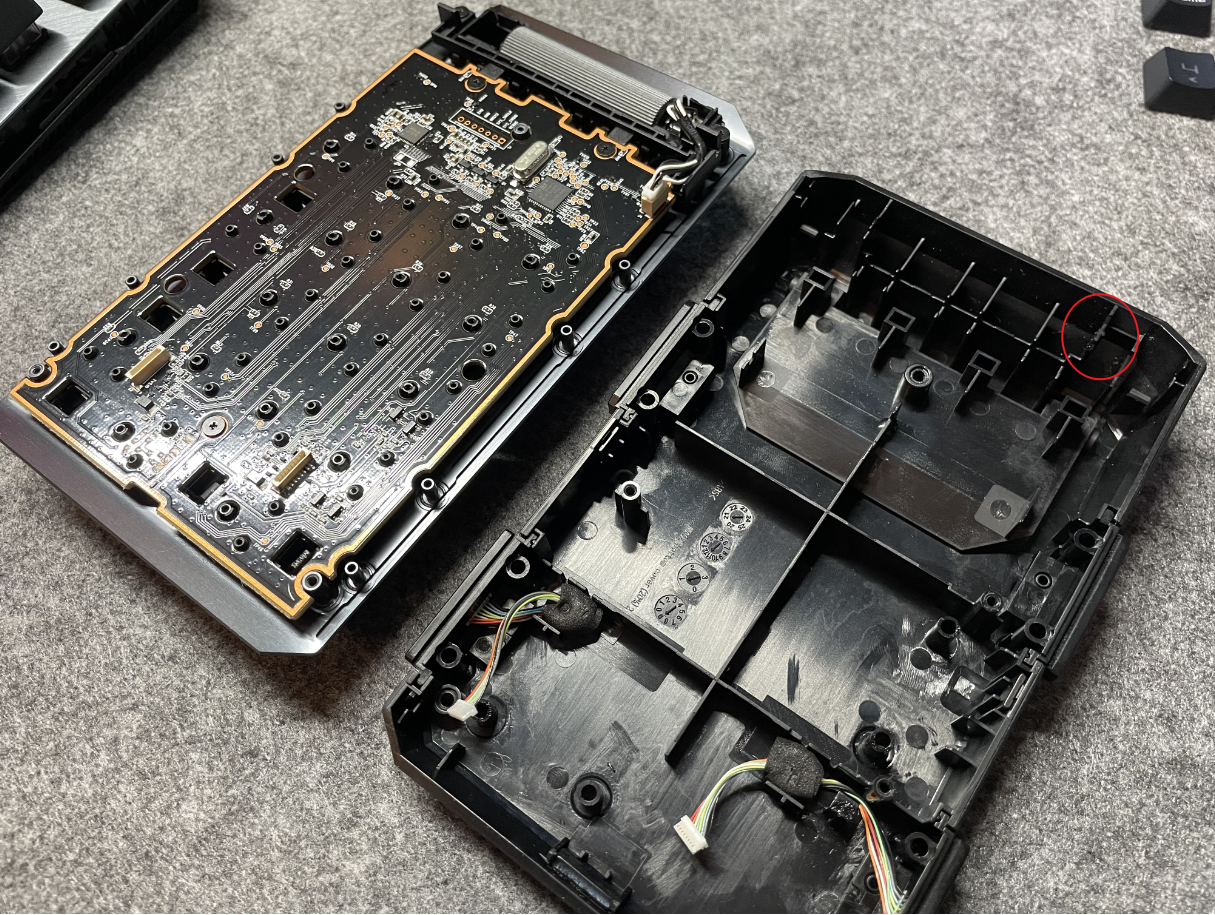 应该是铝壳摔的翘起来,导致里面有了空隙,后壳这个小塑料结构顶不住滚轮的轴导致滚轮按压塌陷。▼▼▼