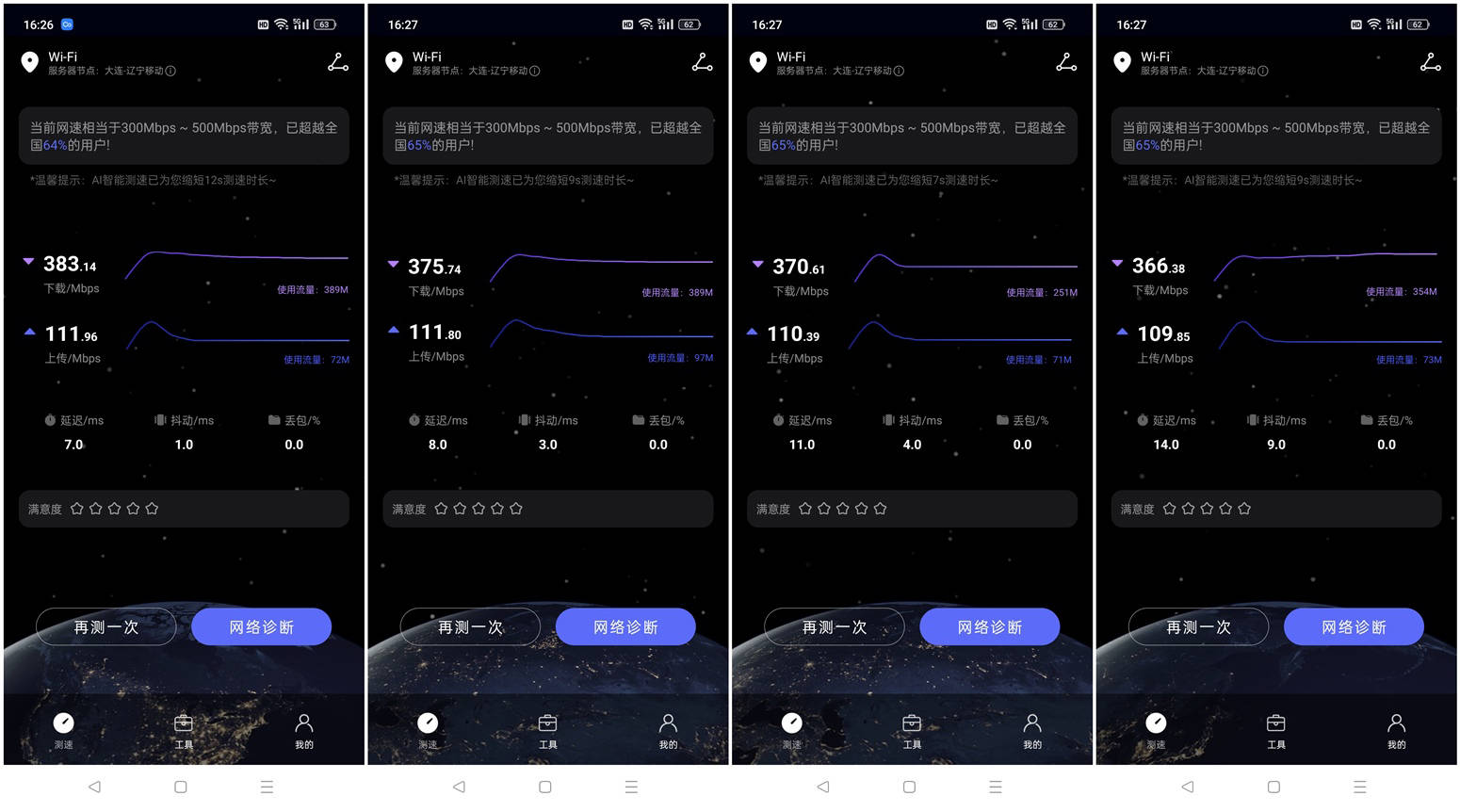 对于锐捷雪豹的网速表现,则是通过第三方测试软件进行了实测,锐捷雪豹X30E 在300M网络环境下表现,测试结果如上图所示,分别测试了在同一房间内以及隔着一堵墙和二堵墙的情况下的网速,测试结果显示,这台路由器有着较强的穿墙能力,路由器和设备在同一房间内下载速度达到了383.14Mbps,上传速度达到了111.96Mbps,在隔1堵墙的卧室里下载速度达到了375.74Mbps,上传速度达到了111.80Mbps,另一组在间隔2堵墙的测试结果显示,下载速度依然保持在370Mbps,上传速度达到了110Mbps;