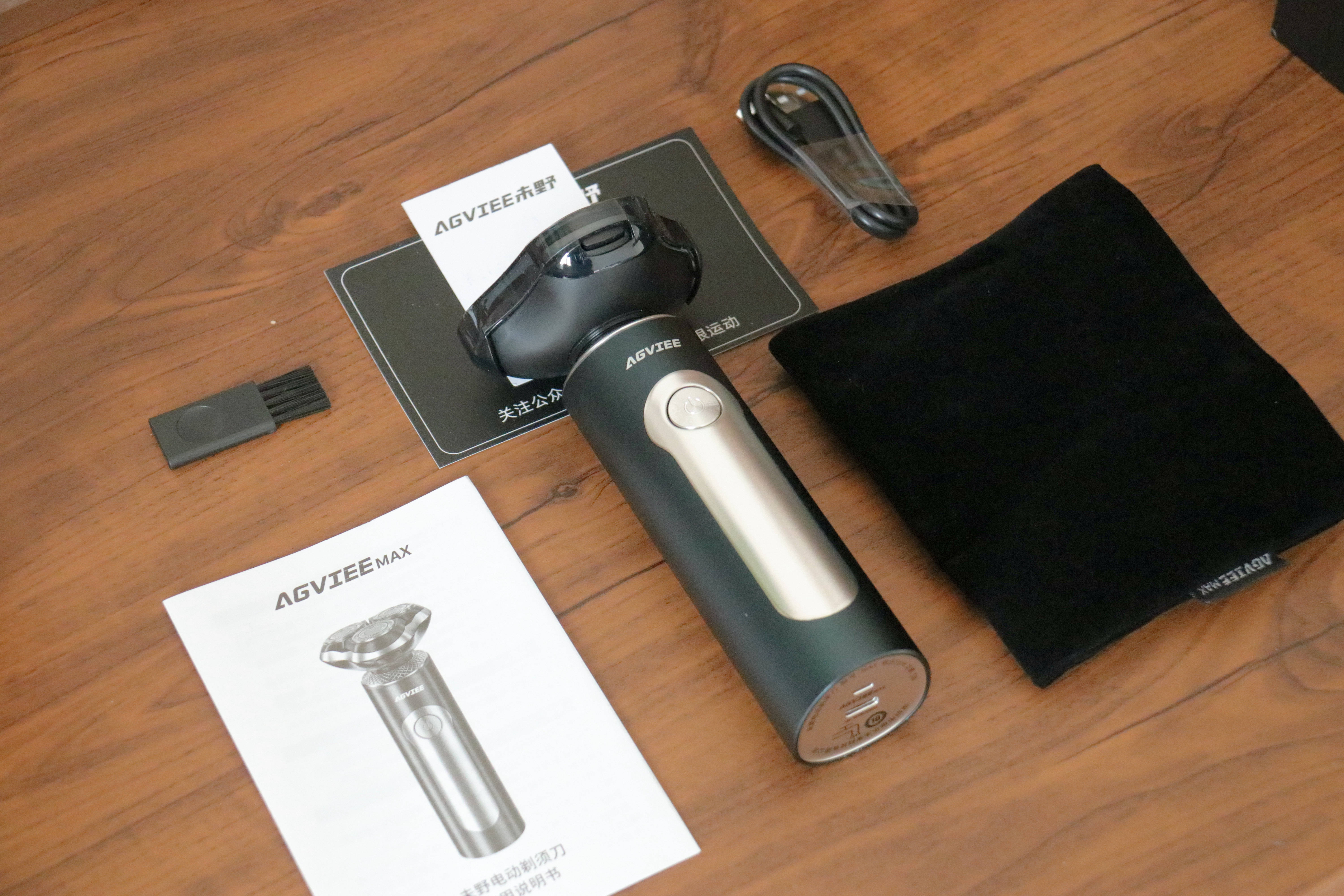 未野电动剃须刀全家福:剃须刀*1、说明书*1、收纳袋*1、充电线*1、清洁刷*1等。