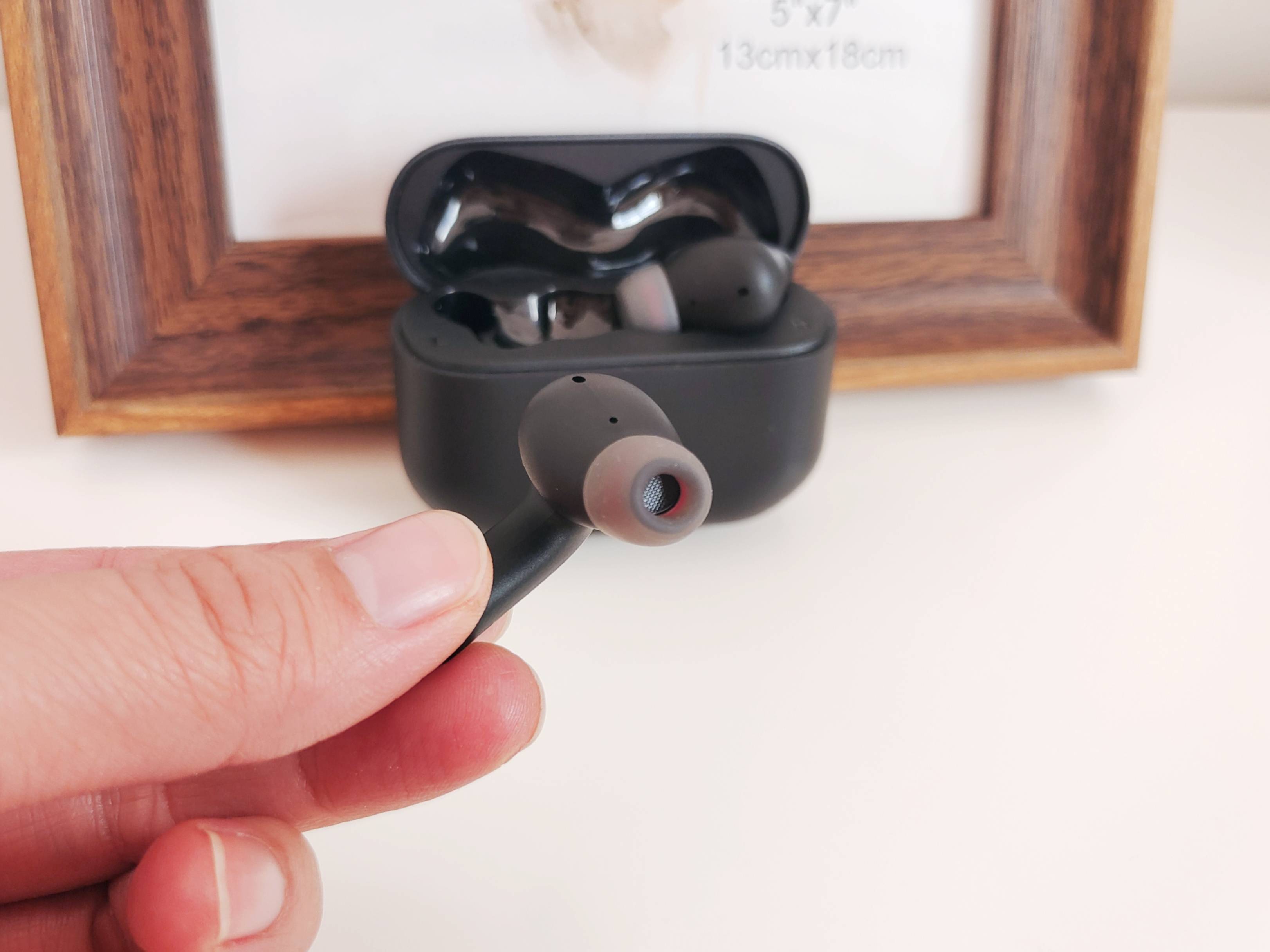 耳机仓盒由上下两部分组成,上盖是是电镀亮光面,像镜子一样光亮。下半部分是纯黑色细磨砂材质,手感细腻光滑,仓盒大小适中,握在掌心中轻松无负担,出门塞进口袋也不在话下。
