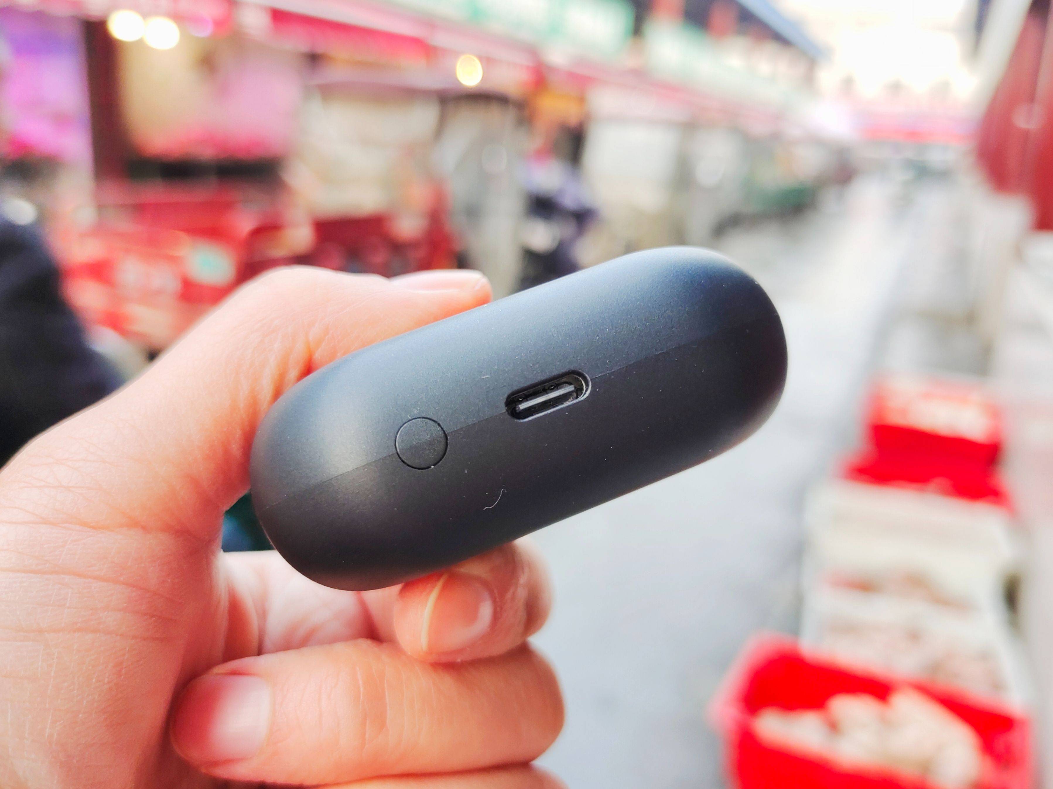仓盒底部是Type--C充电口,这种接口现在很广泛,家里的电子设备很多都是这样的接口,都可以随用随充。充电口的左侧有一个隐形的圆形按钮,轻按一下,仓盒正中央立刻显现出剩余电量,以百分比的形式,数字清晰,一目了然!