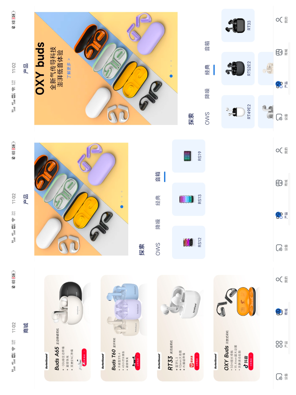 可以看到在APP界面上,降噪模式和通透模式可以自由调置。假如你不喜欢出厂设置的快捷功能键,还可以进入这个操控台,在里面可以调整接打电话或者切换音乐的快捷方式。而且还有商城,里面有关于BarbetSound产品的图片和介绍,可以了解更多的新品。