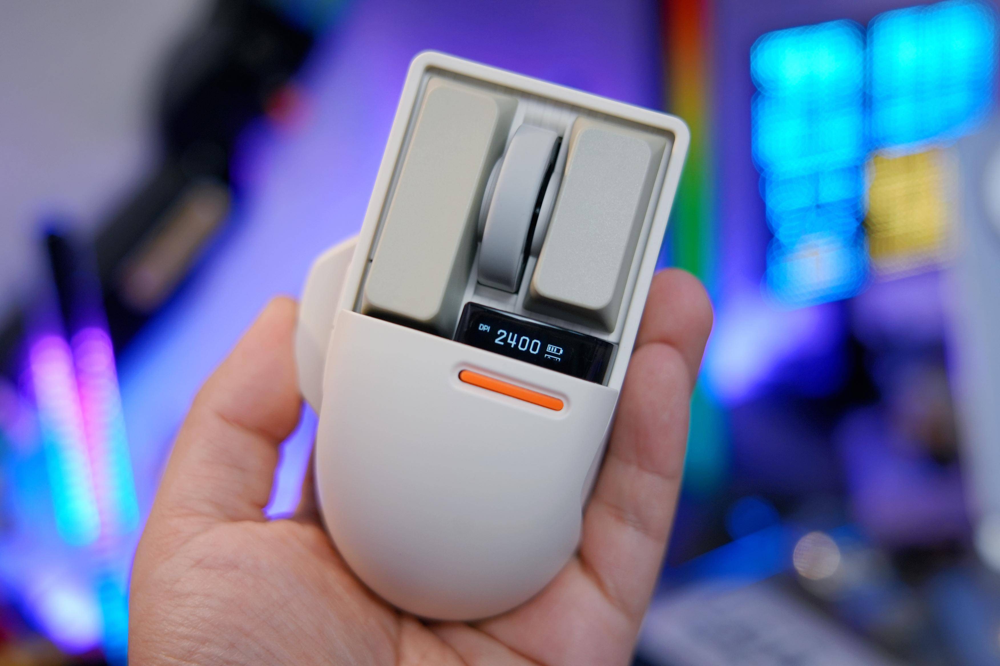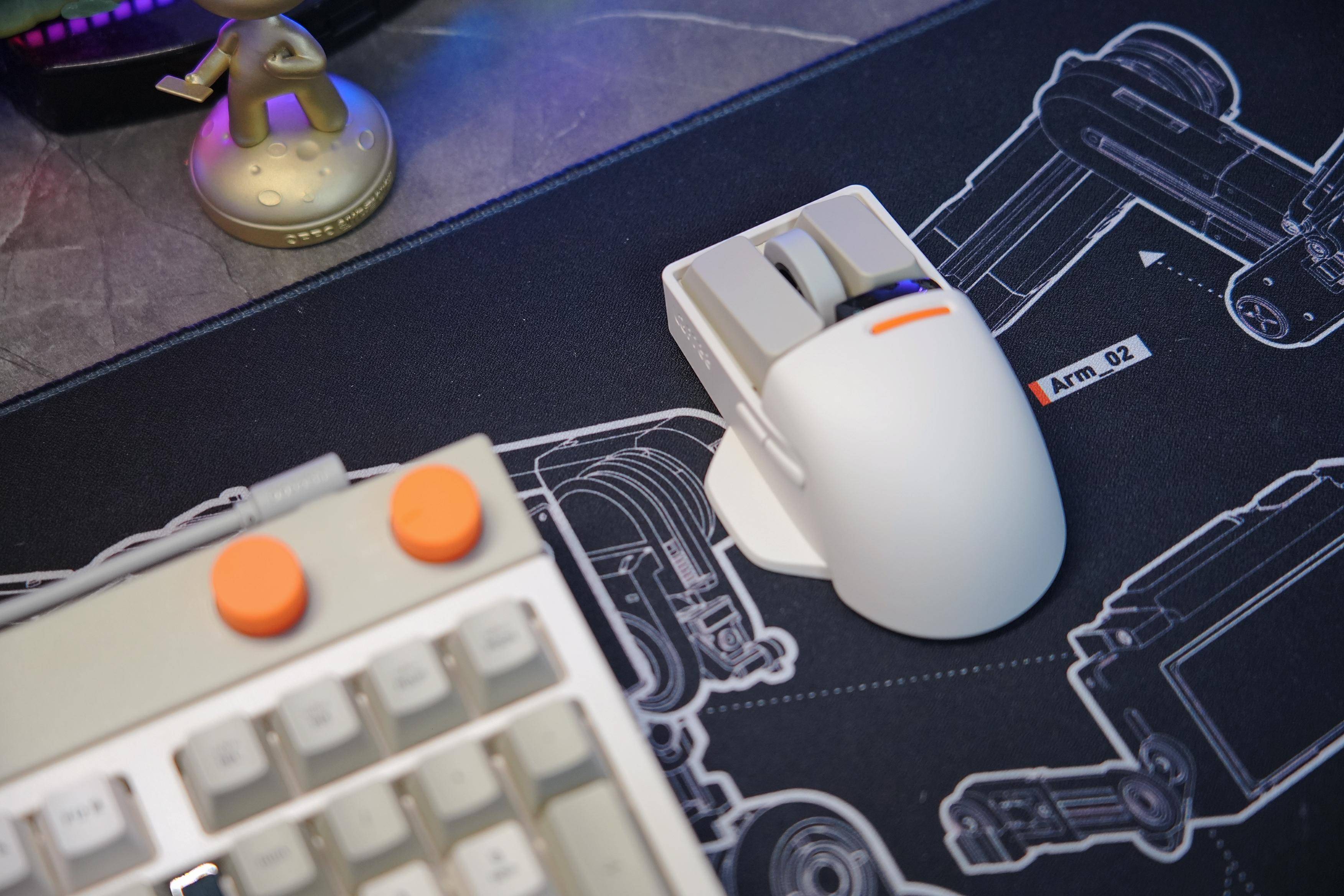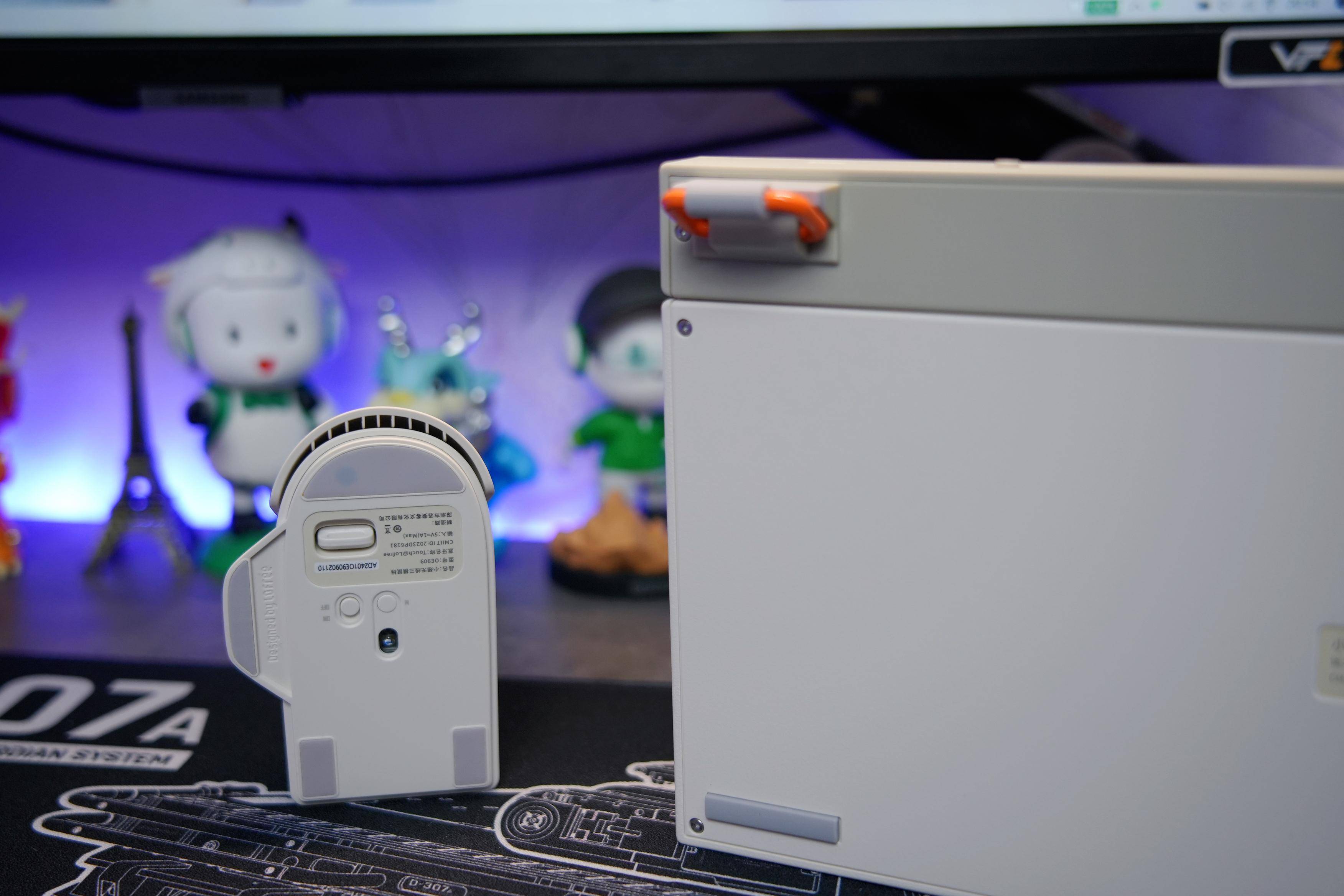 Lofree洛斐小翘三模鼠标。鼠标外观色彩与键盘相协调,采用了米黄色与浅灰色的复古风格设计,橙黄色横条作为点缀,独特整体风格,与市面上大部分鼠标不同。左右按键与滚轮采用独立结构设计,后部流畅弧面,中部的OLED显示屏可以显示电量、DPI和连接方式等信息。