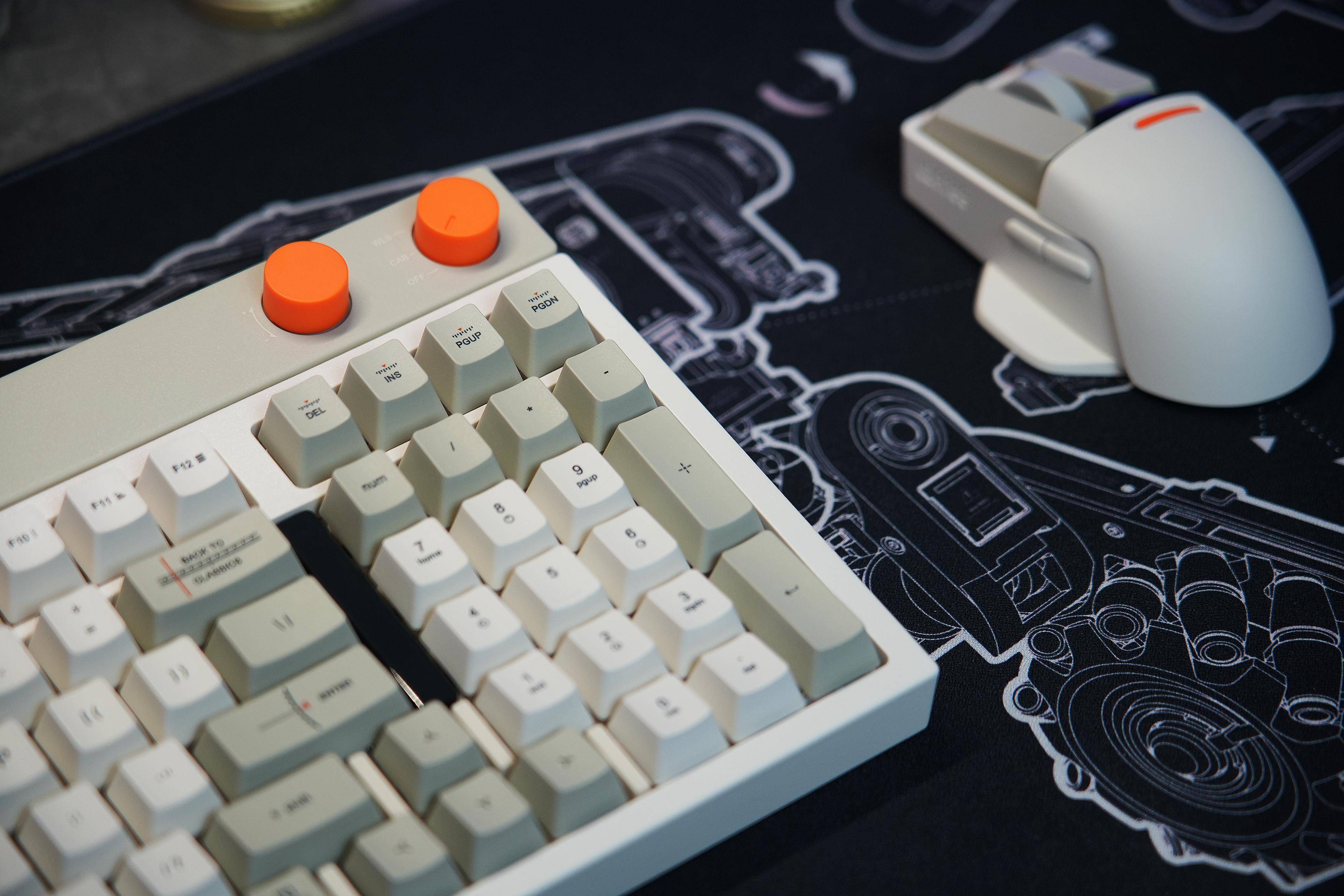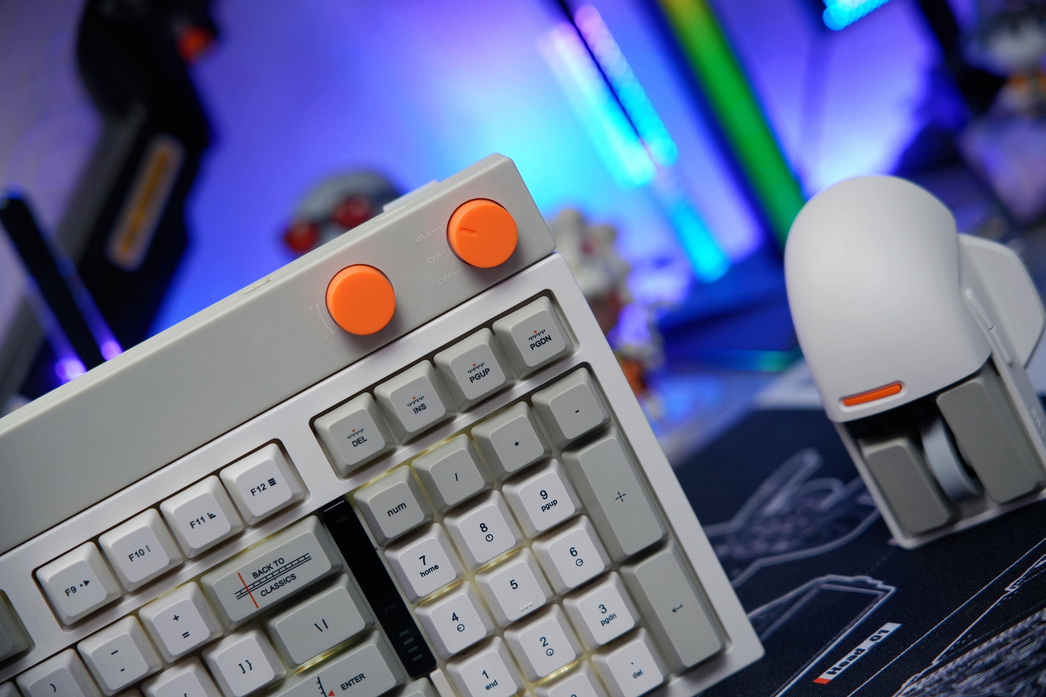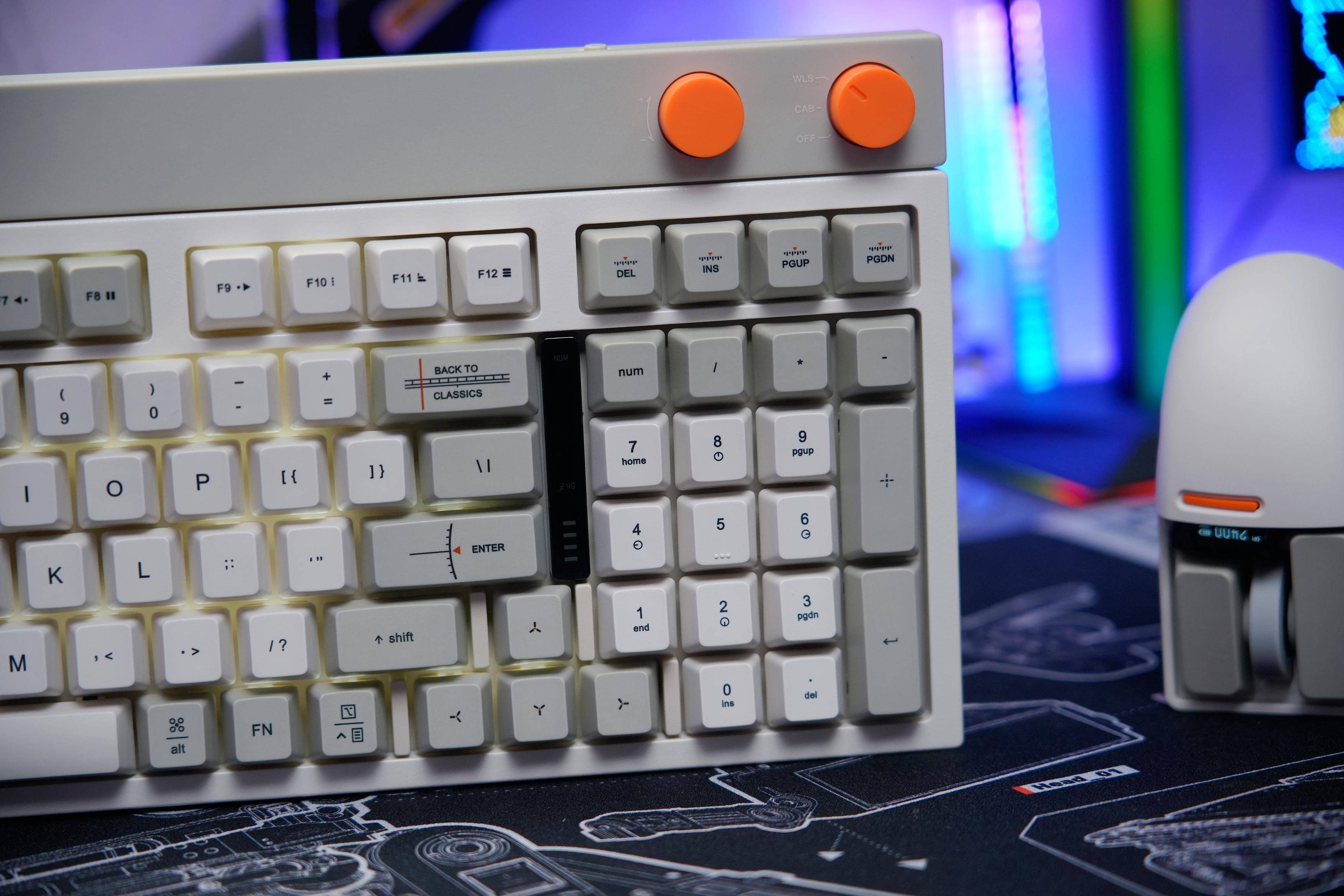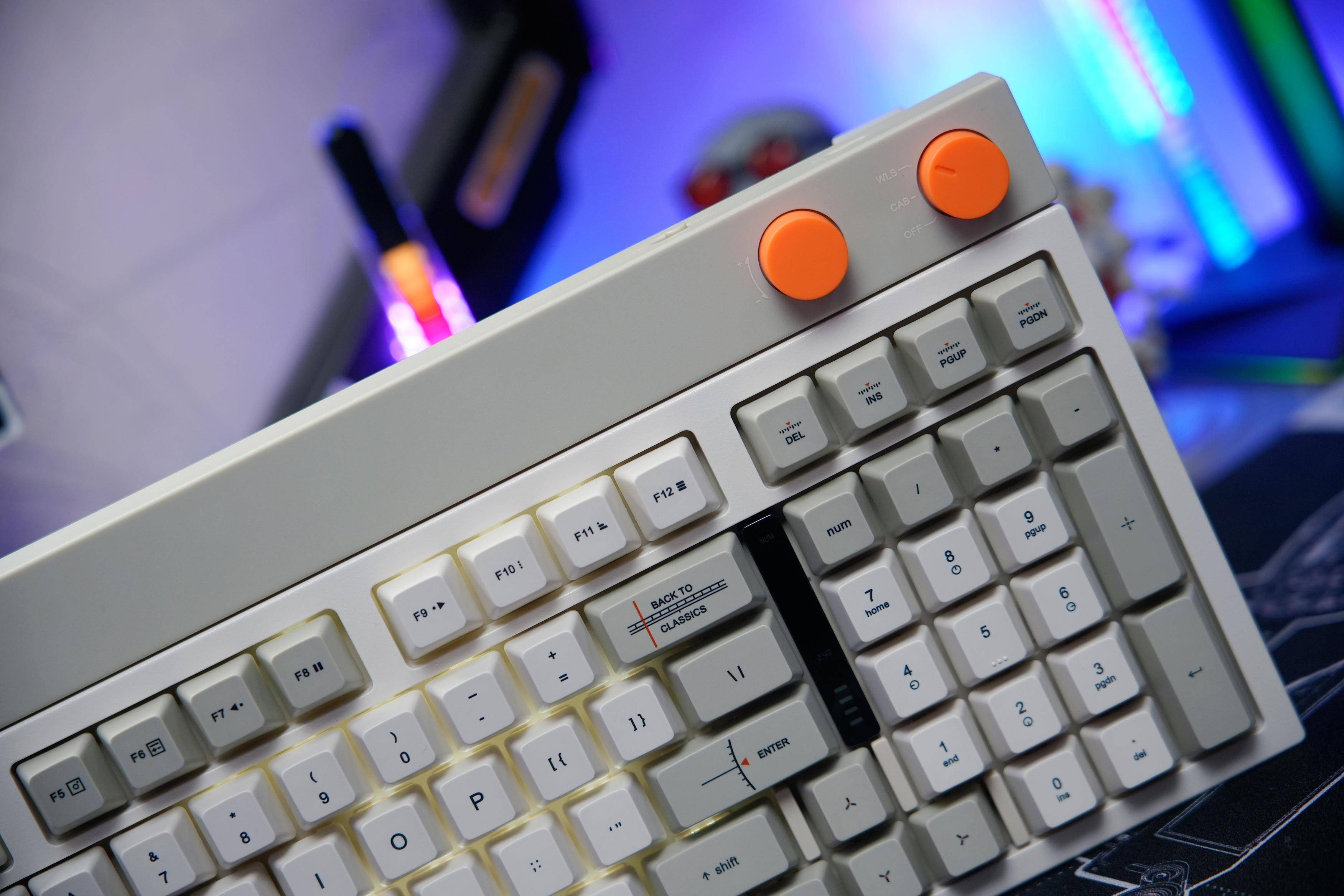 键盘右上方两个橙色快捷旋钮在右上方,分别是音量旋钮和模式旋钮,向曾经的收录机旋钮致敬。操作简单粗暴!左边的音量旋钮不仅掌控音量大小,还能按压切换静音和非静音,看电影时按下就是暂停,太方便。右边的模式旋钮可以瞬间关闭键盘,切换有线或无线2.4G/蓝牙模式。一键操作,爽快得不能再爽快!