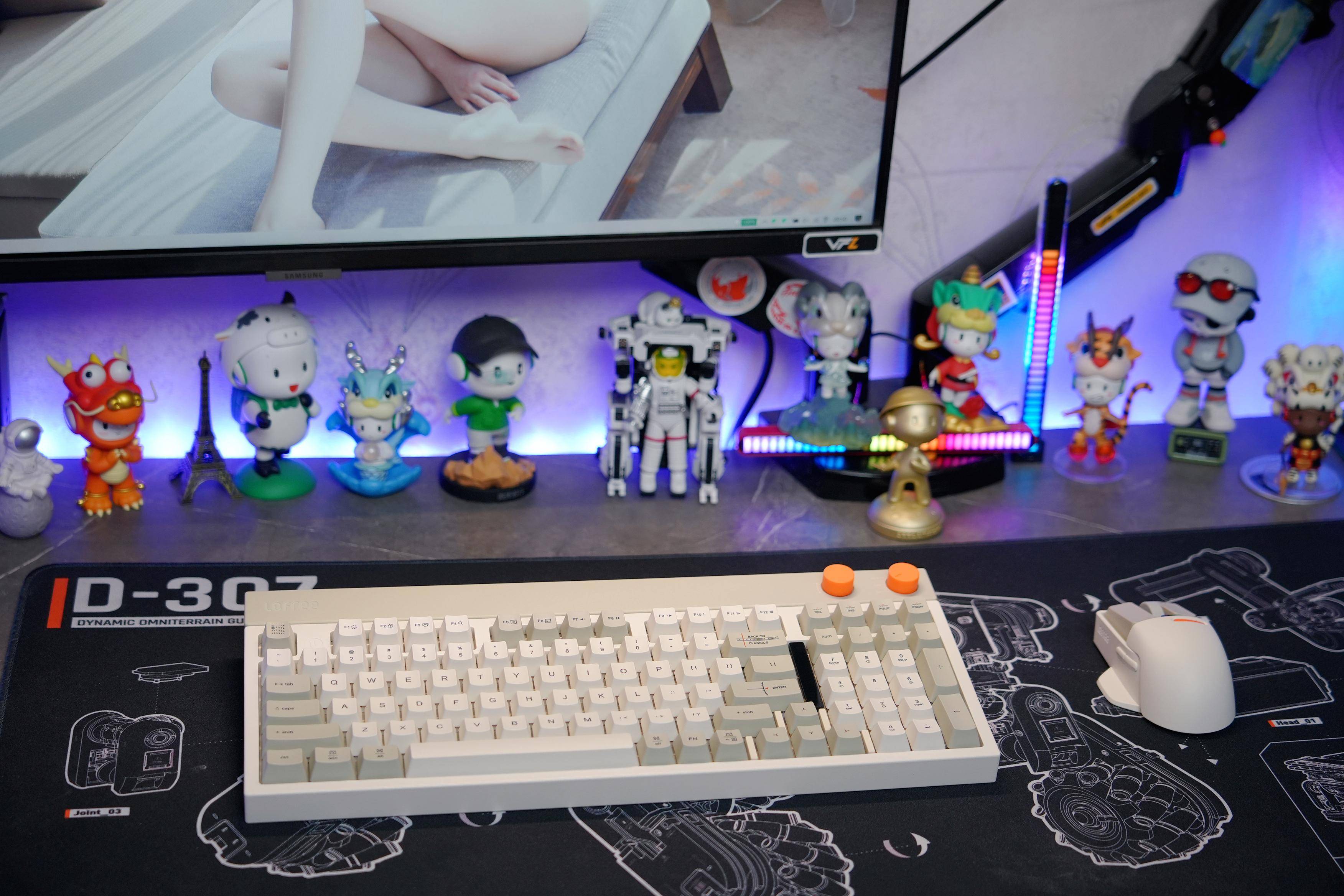 键帽采用了复古配色的PBT材质热升华键帽,OEM高度,设计精致清晰,触感细腻干爽,同时具备耐磨和抗打油的特性,更加耐用,使用体验更好。