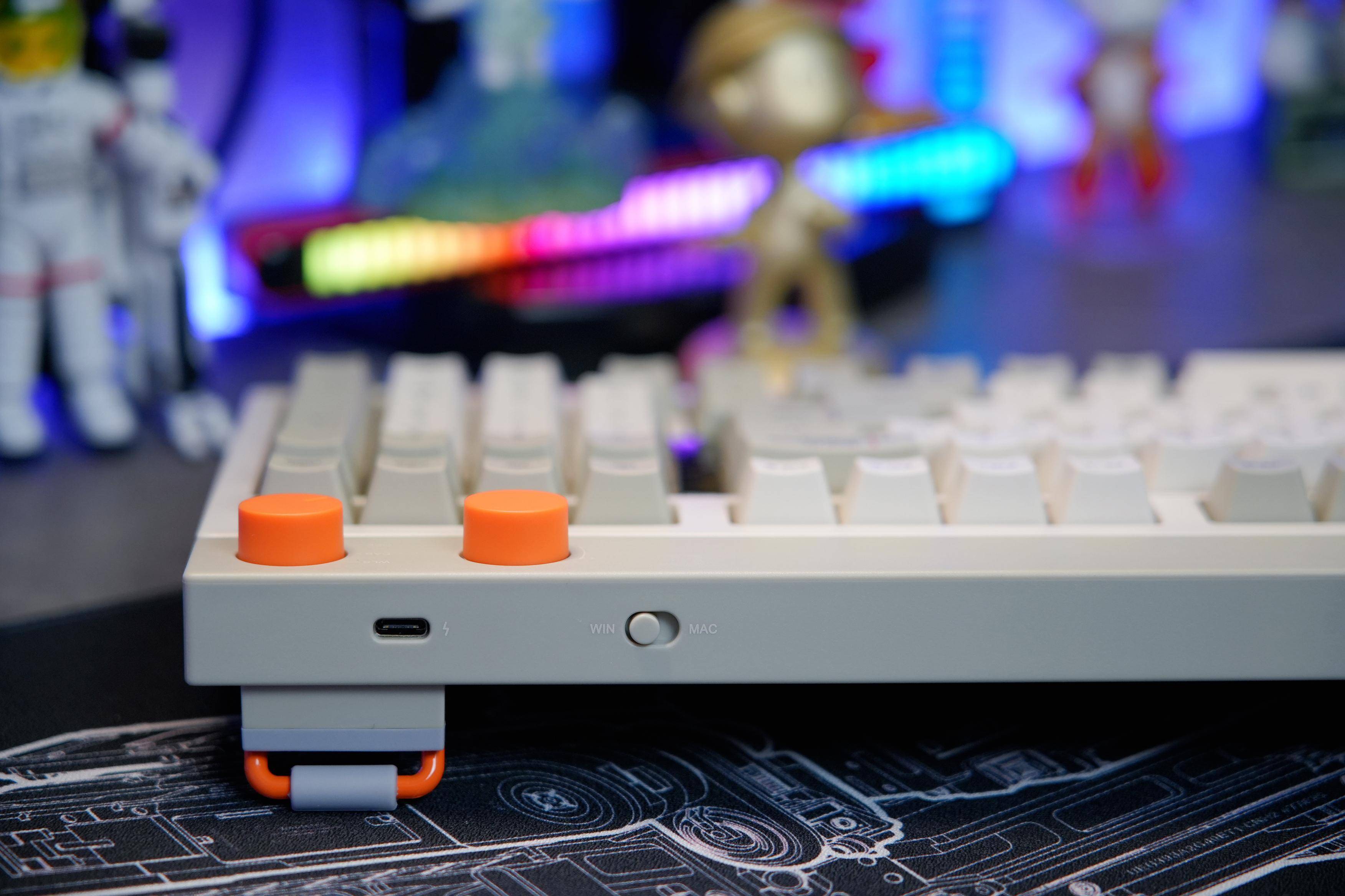 在键盘的右后方,有一个Type-C有线接口和WIN/MAC切换按钮。这个键盘最大支持三台蓝牙设备的连接,并且还可以通过2.4G无线和有线进行连接,连接方式非常多样化,为用户提供了更多的选择。