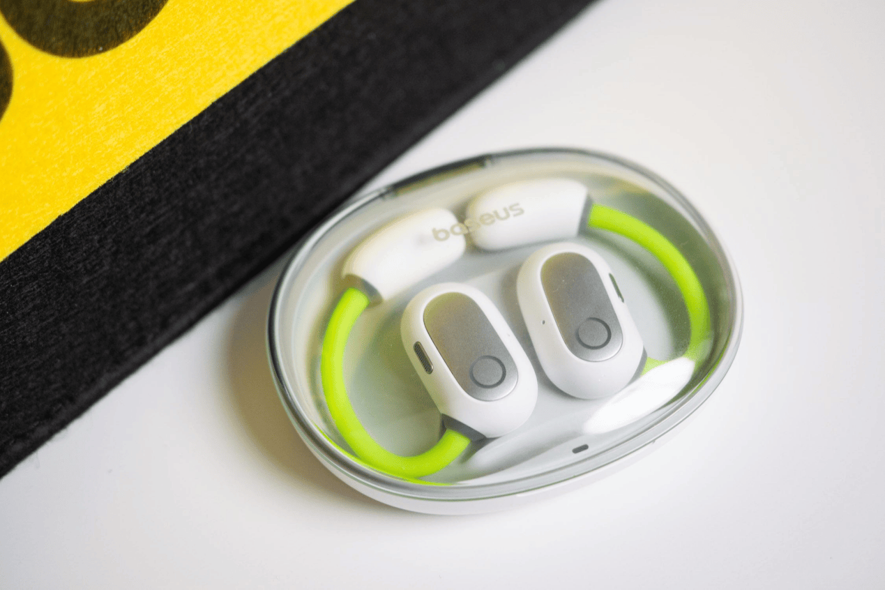 倍思这个品牌在数码界上也是有一定的知名度,旗下主要做生活数码比较多,今年也算是跨行业出了这款最新的开放式耳机,耳机的设计非常独特,荧光硅胶的环保材料,夜跑时使用这款耳机,可以发亮的荧光部分可以起到一定的提醒其他人避让作用。