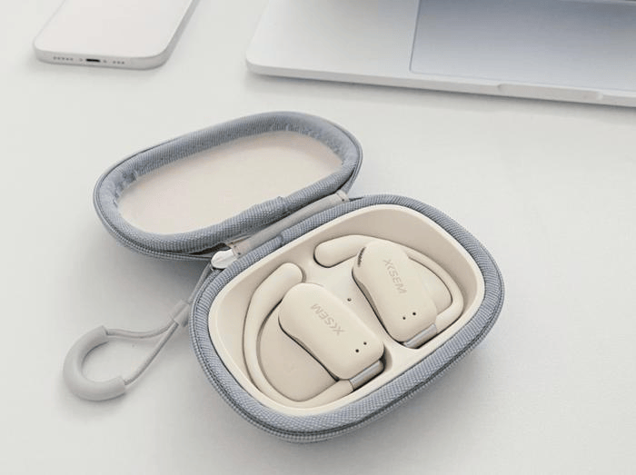 这款耳机拥有比较漂亮的弧度透明充电仓顶盖且顶盖手感滑润,下面是细致磨砂触感。耳机佩戴的方法也比较简单,把耳挂挂上耳朵,然后旋转调整一下,让耳机本体保持倾斜向上的状态即可,对戴眼镜的人士也是比较友好的。音质方面,其内部搭载空气定向传导喇叭,整体质感自然饱满,干净明朗,但低频表现不足。续航方面,单向续航7.5个小时,加上充电盒能坚持30个小时,实测下来还挺准的。