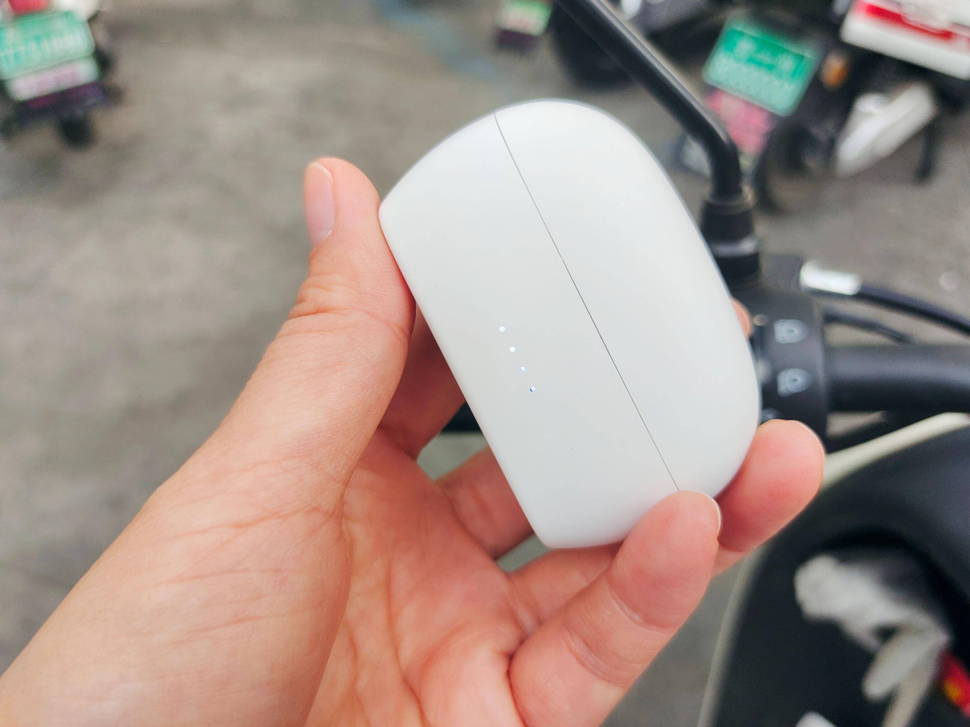 耳机属于璞玉白色,在阳光下充满了光芒,上圆下方,底部扁平,可以轻松稳立在桌子上。上仓盒正面是显示电量的四盏指示灯,背面则是Type-C充电口。