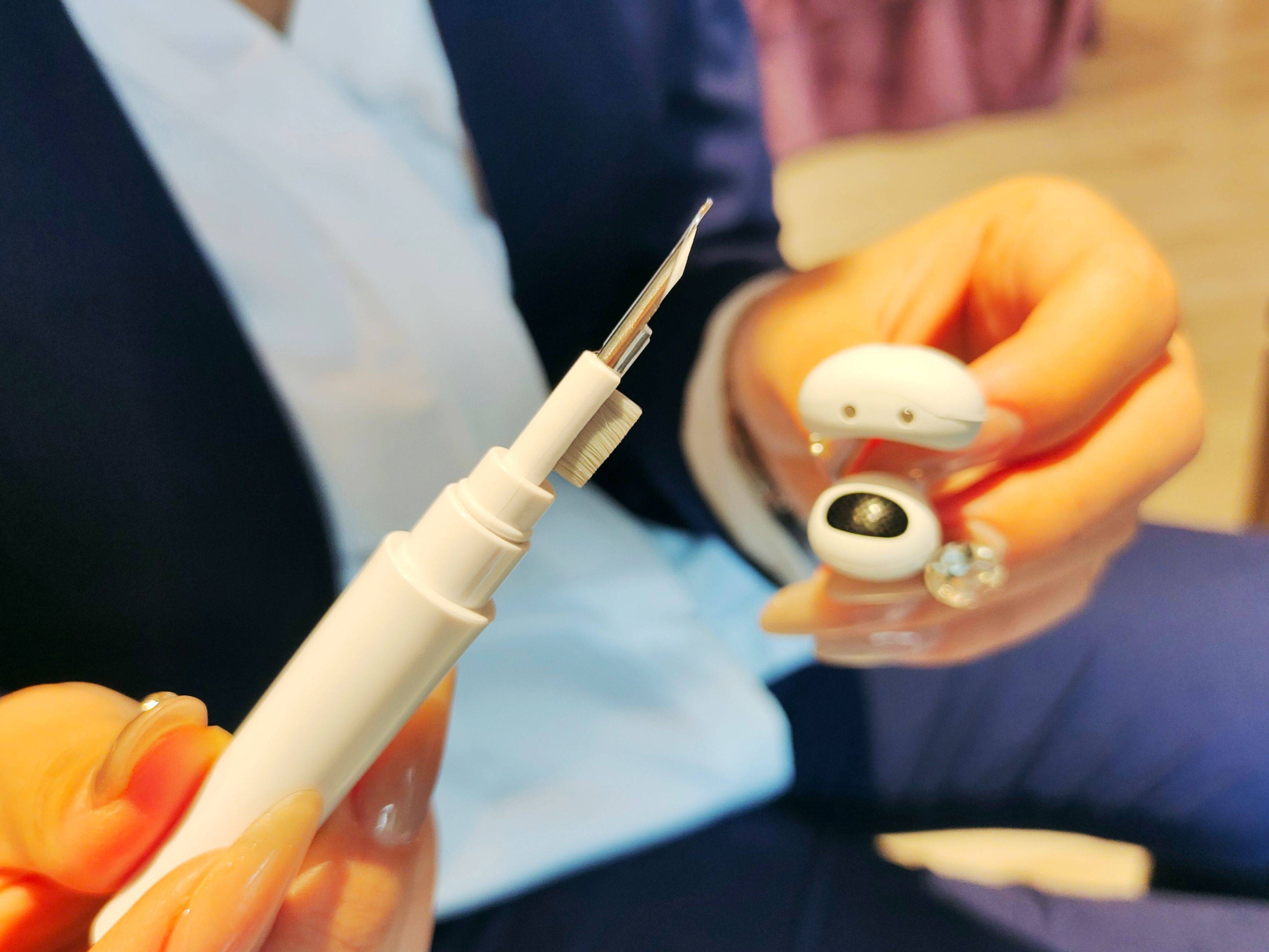 弯弯的半圆钢丝选用的是德国进口钛合金记忆丝,柔软耐用不变形,耳朵肥厚或者小薄,可以随意调整大小,松紧度撑握在自己手中,所以长久佩戴耳朵也不会痛。并且有清洁笔保驾护航,经常把耳机清扫一下,耳机寿命也会更久。