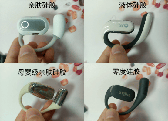 总体上来说四款开放式耳机的材质都是以亲肤的硅胶材质为主,不同的是南卡OE MIX的耳挂整体都是采用的母婴级亲肤硅胶一体形式,韶音和倍思的材质比较普通,但是也还是蛮舒服的,OladanceOWS Pro采用的都是两种材质相结合的分体形式,耳挂根部采用的是硬塑料,可调节性会相对差一点,但是总体上来说,还是没有南卡OE MIX的调节性好。
