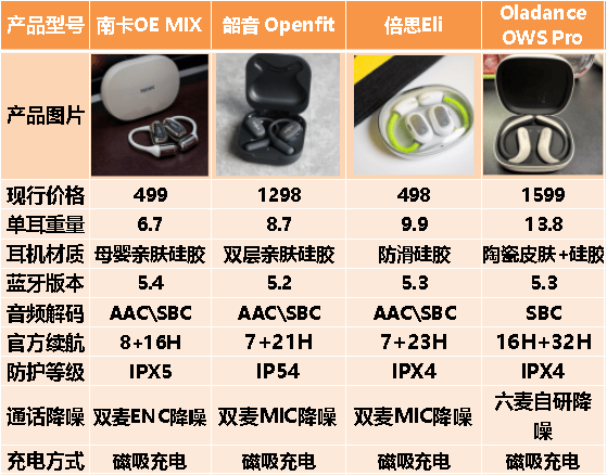 总共是四款耳机:南卡OE MIX、OladanceOWS PRO、倍思eIi、韶音Openfit,我们先来看看这四款耳机的情况: