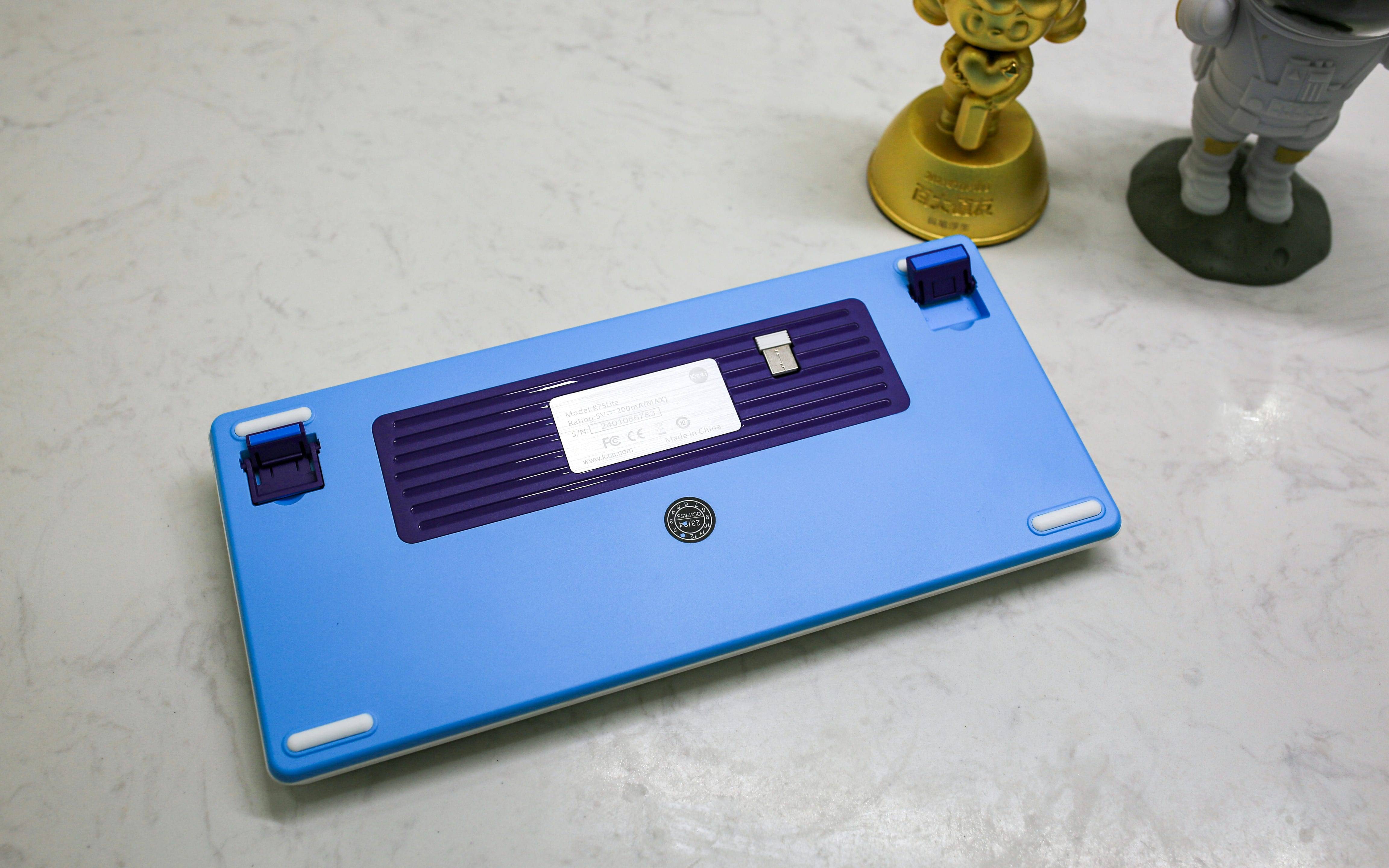 这把键盘的设计确实很有那么一回事。上下盖的白蓝配色,背后那块紫色塑料饰板,还有金属铭牌,每一个细节都透着复古的气息。