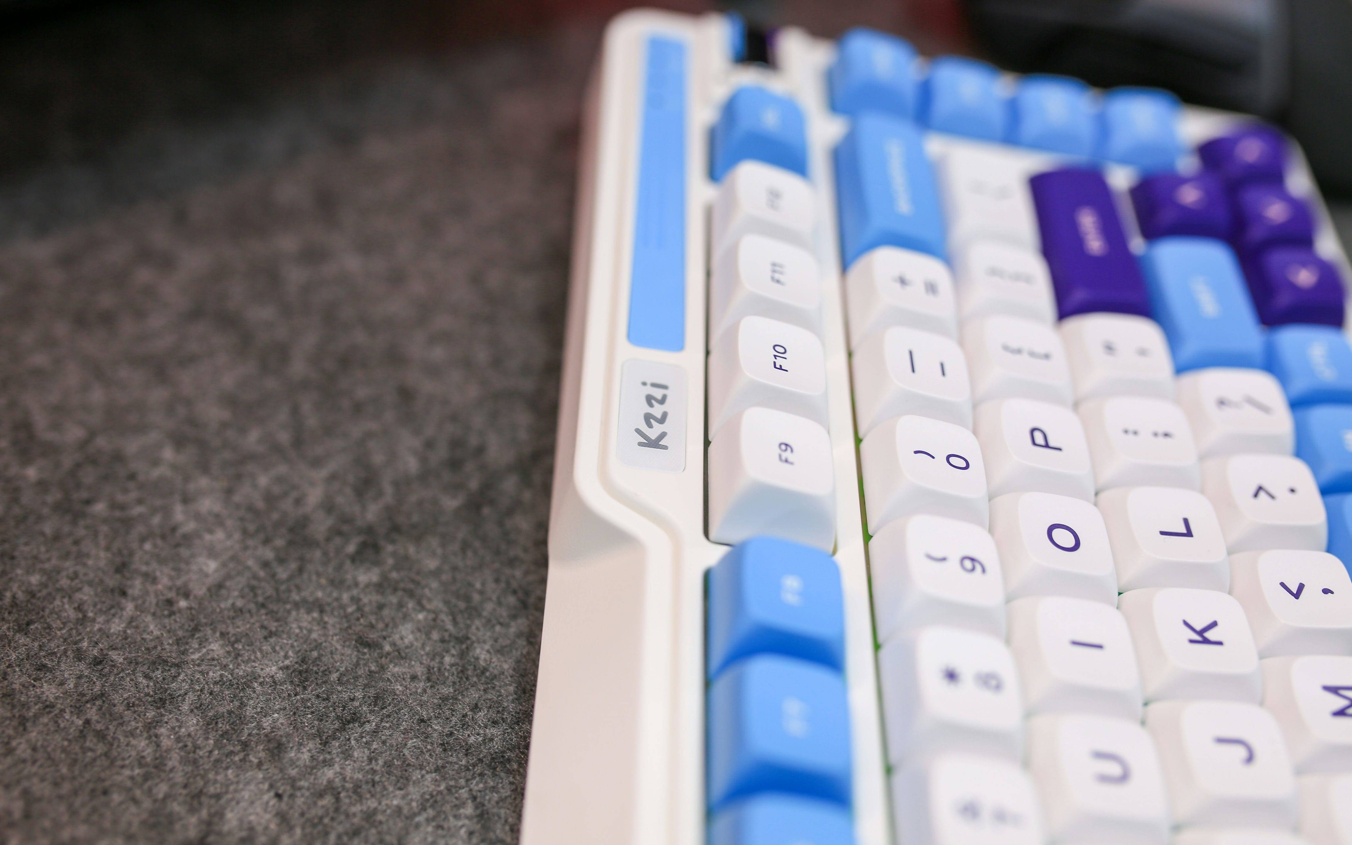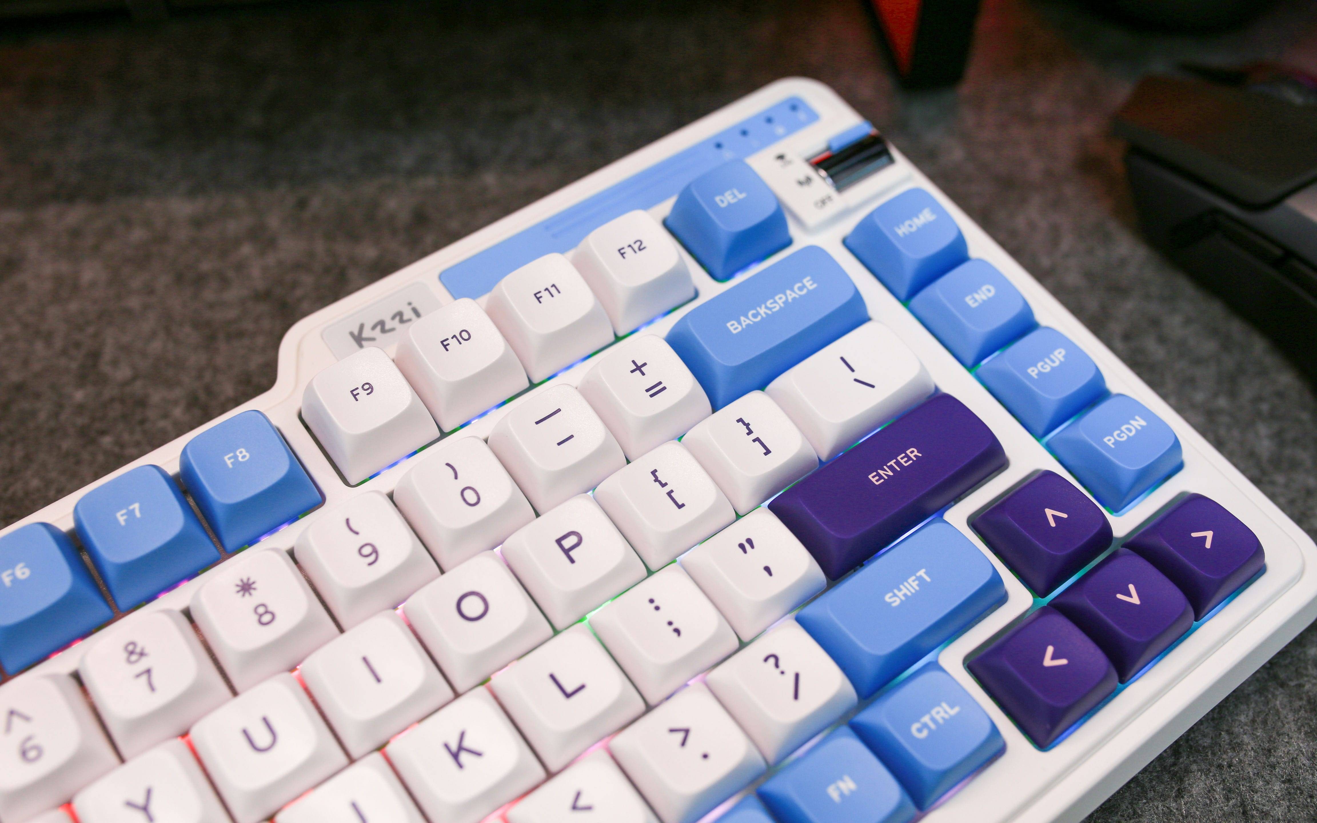 特别喜欢键盘顶部那条蓝色装饰条和四颗指示灯,白灯亮度刚刚好,看着很舒服。然后,键盘右上角那个三模拨杆,超级实用,2.4G、蓝牙、有线,想怎么切换就怎么切换。说到这个拨杆,真的,摸起来感觉超级好,每次切换模式的时候都有种小确幸,阻尼也刚刚好。键盘左上角的那四个指示灯下面的三挡拨钮,操作感也是杠杠的。和KZZI K75比,这款把小屏幕给去掉了,少了电量显示,可能会有点心慌,不过也让外观看起来更简洁。毕竟价格在这里摆着,差距300元左右了。