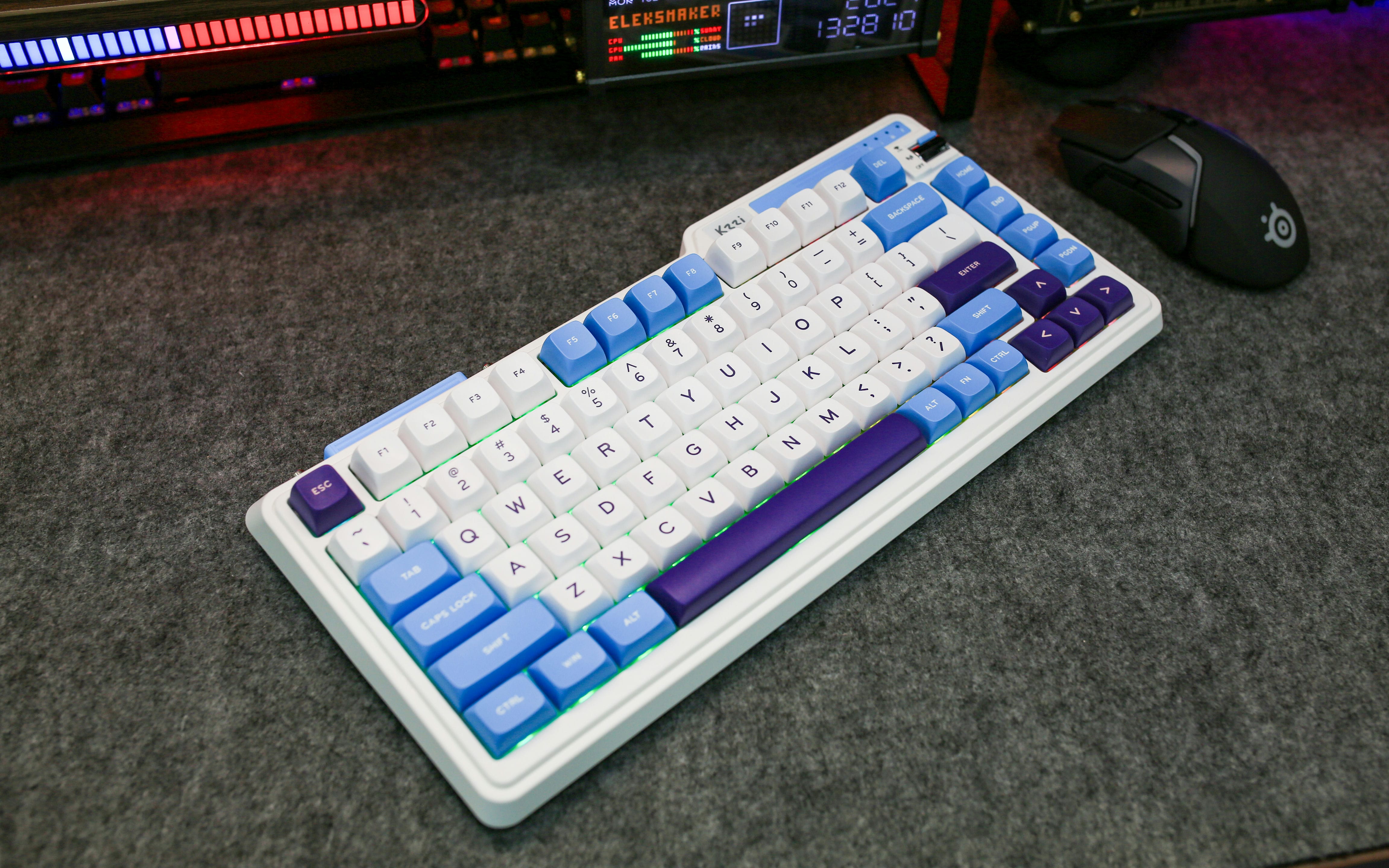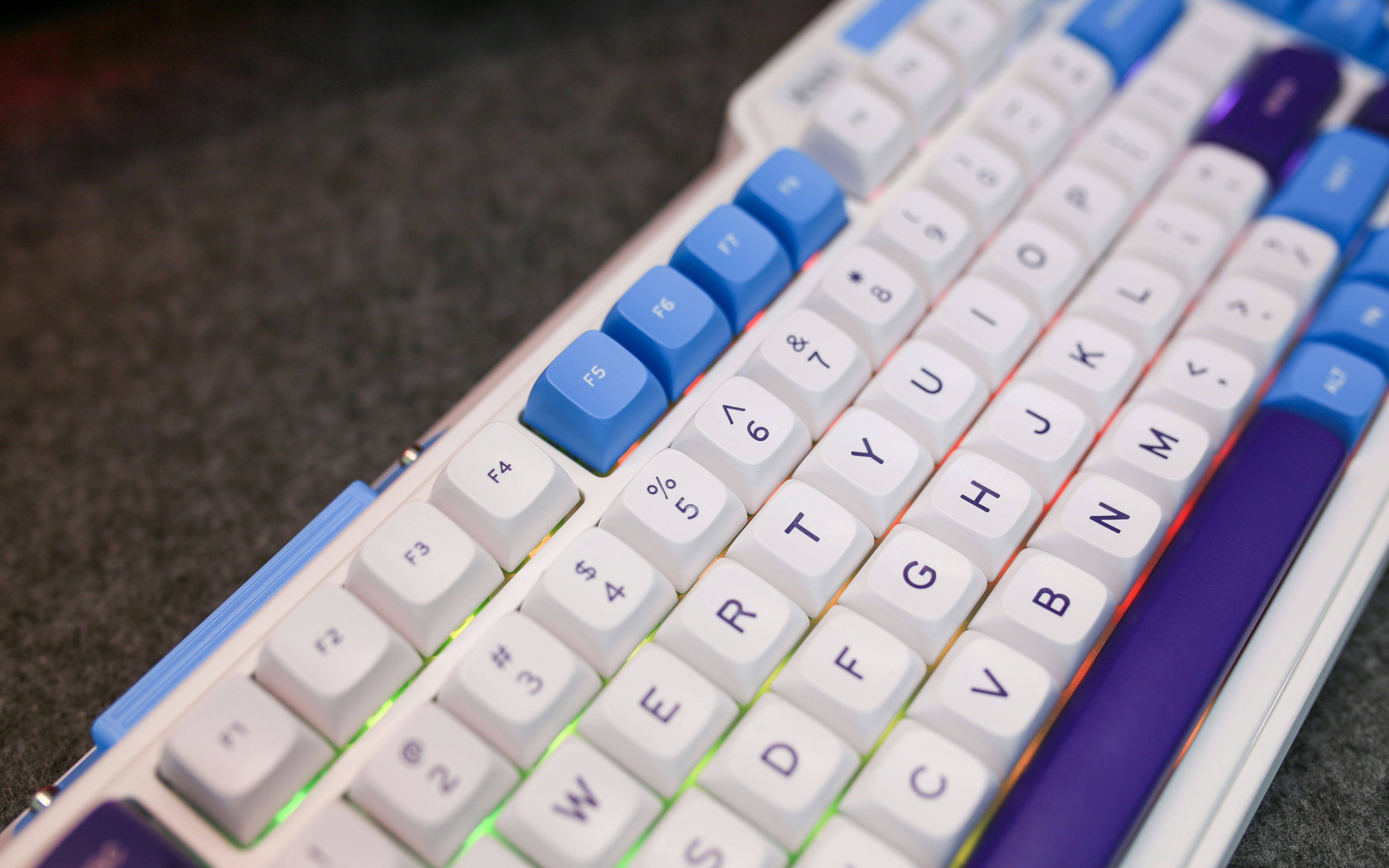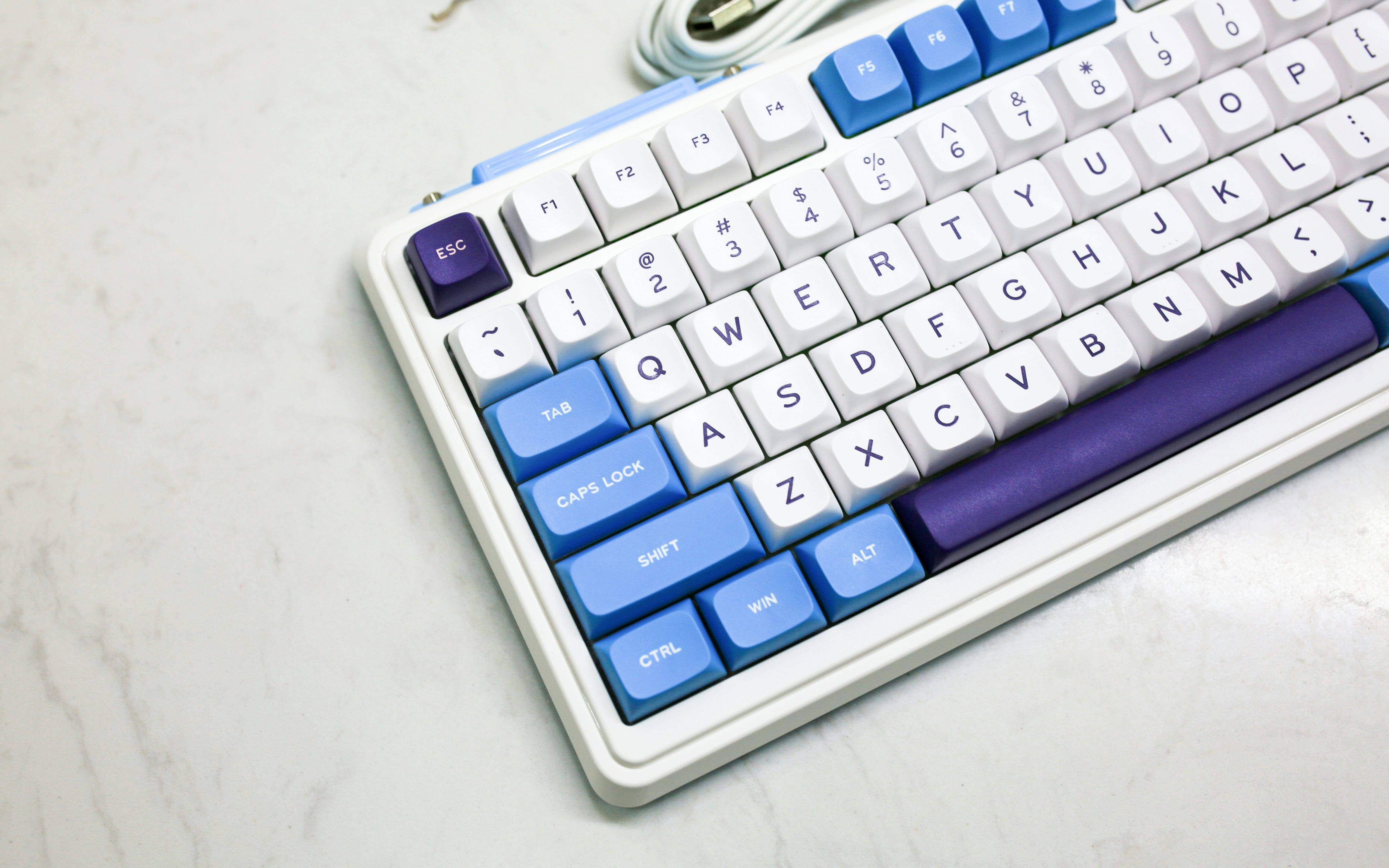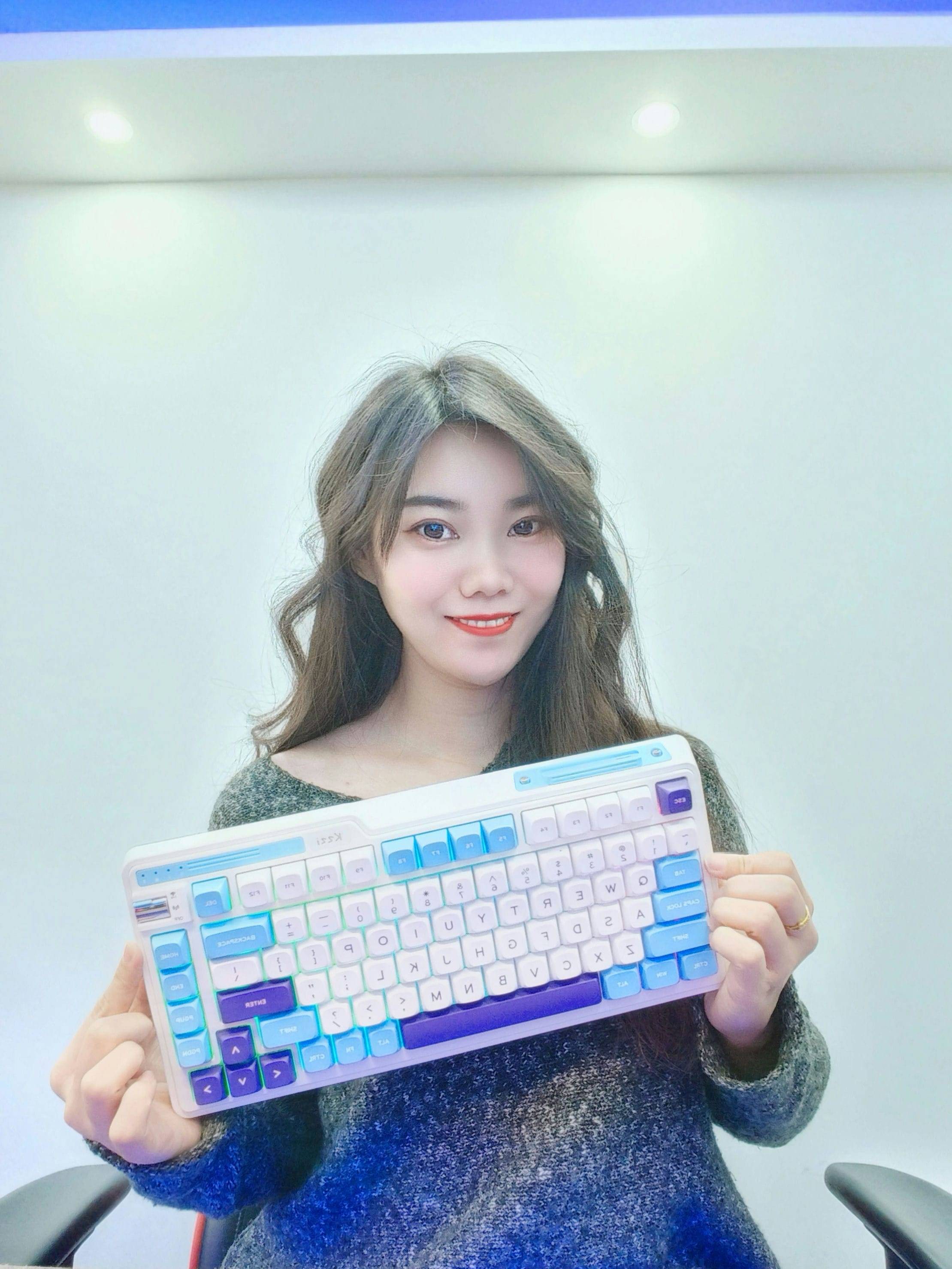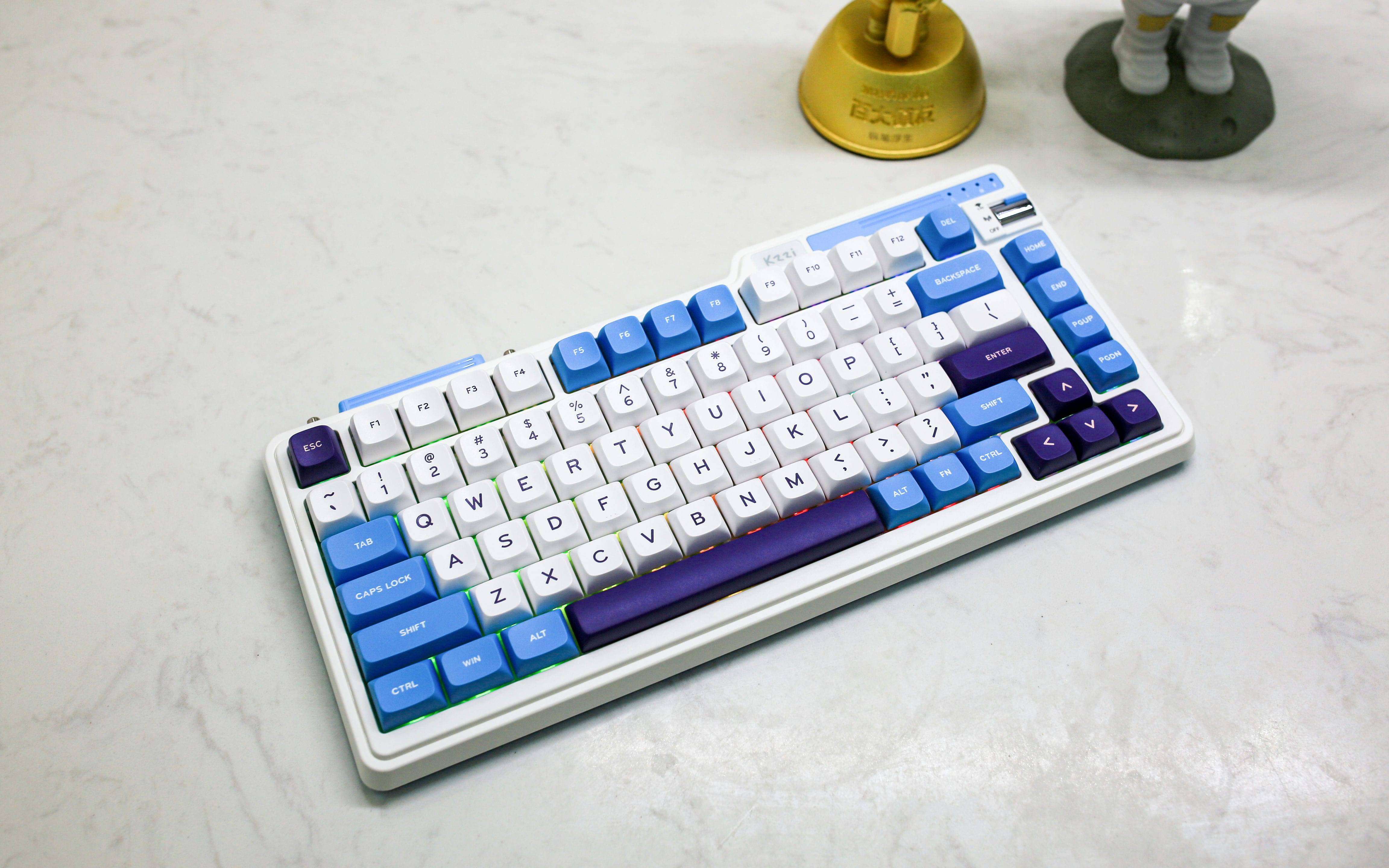 它是 75 键的布局超适合我,小巧又不失实用,一点都不占桌面空间。而且,我特别喜欢它的复古风配色,种类挺多的,每一种都追踪着近两年的流行趋势,我自己选的是碧蓝海,海蓝色很清爽,外观看着超有感觉。