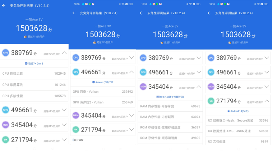 手机最硬核的地方要先看它的CPU。而一加Ace 3V采用了高通骁龙 7+ Gen3 处理器,核心架构与旗舰级的8 Gen3类似,制造工艺也都是台积电4nm工艺,主频2.8GHz,八核心架构及高通Adreno732 GPU。而且使用了旗舰采用的LPDDR5X+UFS4.0存储规格,内存起点也很高,12GB+256GB 起步,最高到 16GB+512GB 的超大内存版本可以选择。这样的配置放在2000+的机型上厂家可是纯纯的放福利了。