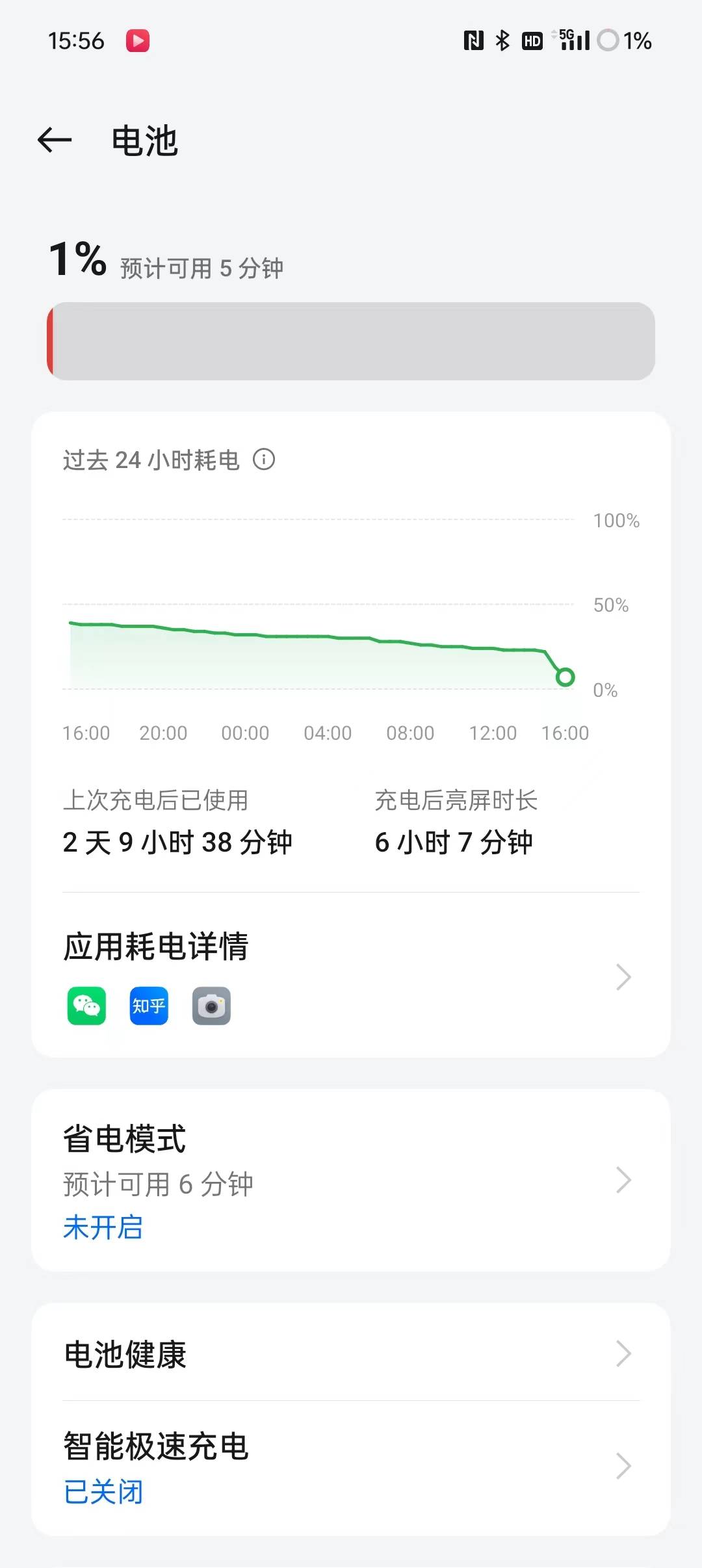说到这个电池,那顺便说说续航,续航是我的刚需了吧,选中一加ace3V也是有一部分续航的原因,一加ace3V用的是5500毫安电池和100w有线快充的,官方续航DOU是1.86天,我也看到好多大V老师们的续航排行榜,一加ace3V几乎都是前5的存在,个人实测5G网络在网,我主要是刷微信、还有刷刷知识类app,还有拍拍照,没想到用了2天9个小时,亮屏时长还有6小时7分钟,最终剩余1%。没有任何续航焦虑,100W快充充30分钟就可以充满了。