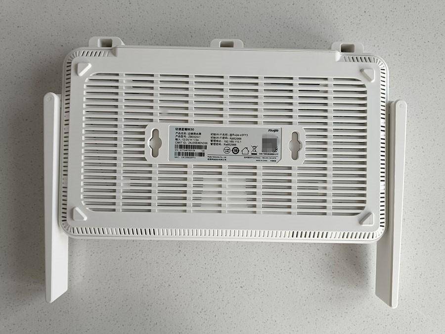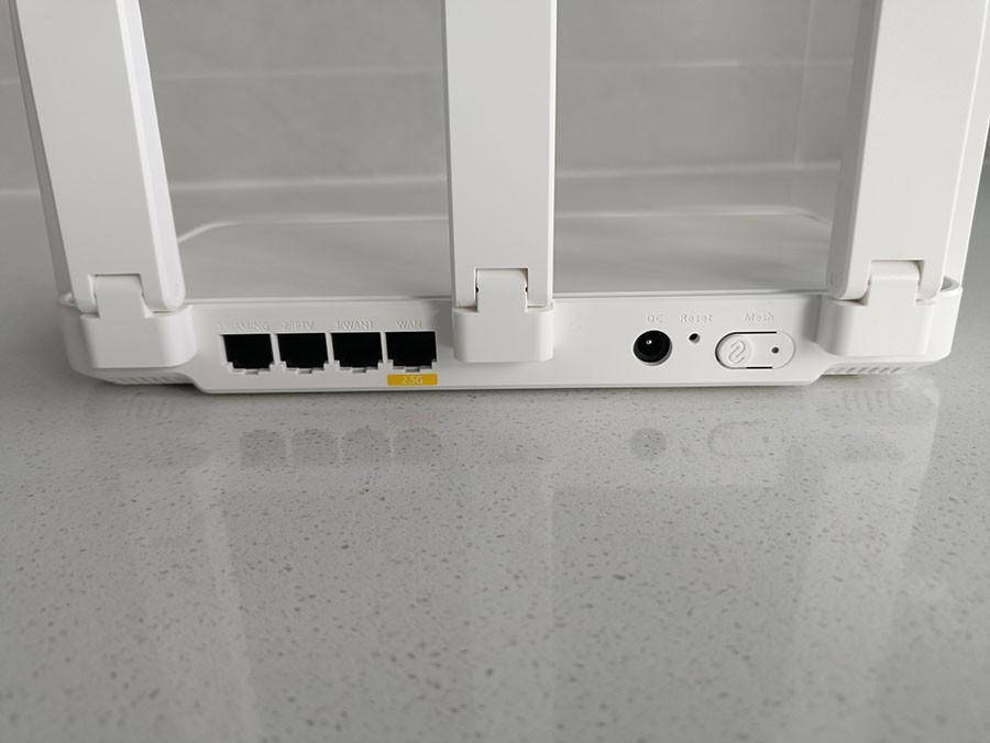 路由器背面配备了1一个2.5G口、三个千兆网口、电源接口、重置复位按钮以及Mesh按键。值得一提的就是这个2.5G网口,能够榨干2000兆宽带,所以现在普及的千兆宽带都能够使用。全千兆网口,在接入网线的情况下也能够有效的保证网络。一键组网的Mesh按键也是非常的方便,在使用锐捷路由器组网的时候可以使用一键组网功能非常的方便。