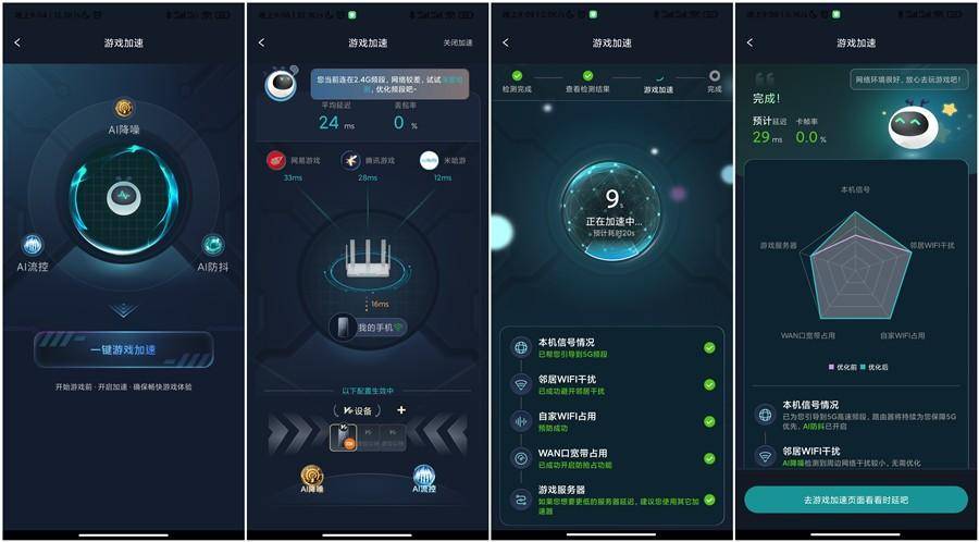 进入游戏前先在APP打开游戏加速模式。点击一键游戏加速就可以完成加速,当网络设备进入游戏网络的时候会自动进入游戏加速设备列表。当游戏速度感觉有问题的时候还可以进行游戏加速检测,直接检测出问题所在并进行优化。AI流控技术可智能识别游戏流量,并确保其优先级,即使在其他设备进行大流量活动如下载或直播时,游戏延迟依旧能稳定在40ms左右,有效避免了团战时因网络问题而出现的卡顿现象。AI降噪技术则专注于解决无线干扰问题。在实际测试中,当存在其他Wi-Fi干扰源时,通过一键开启AI降噪,游戏延迟得到了显著改善,保持在40ms的低延迟状态,为用户提供了更加沉浸的游戏体验。玩游戏再也不用担心网络的问题了。AI防抖则是让你在隔墙远距离也能拥有稳定网络,上分打团更丝滑。