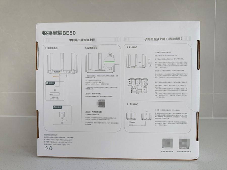 包装正面使用了产品渲染图作为封面,下面特别提出三个主要宣传功能,分别是信号强、游戏又快又稳、设备越用越快。包装盒的背面是路由器安装说明书,分别说明了两种情况,分别是单台路由器连接上网和子路由连接上网功能。能够看到路由器设置非常的简单,使用APP配置上网就可以了。