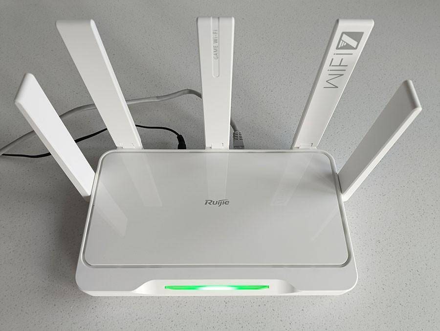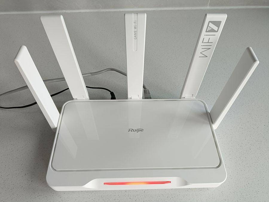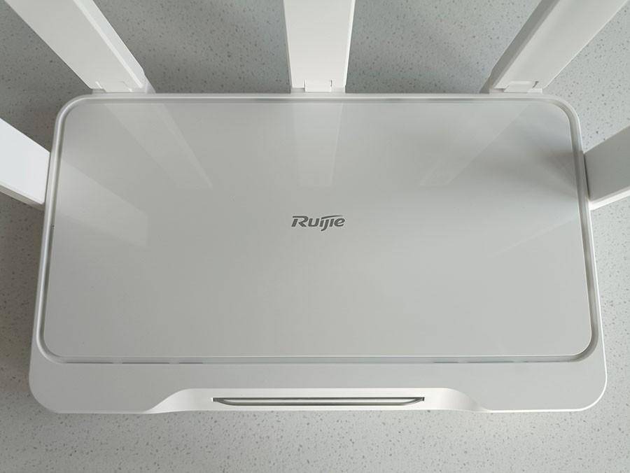 从路由器能够看到,这款路由器配备了5根天线,正前方设置了路由器指示灯中间位置采用了镜面设计,中间为锐捷的logo。细细的看能够发现路由器上面的凹陷部位是有通风口的,这也给路由器散热提供了通风。