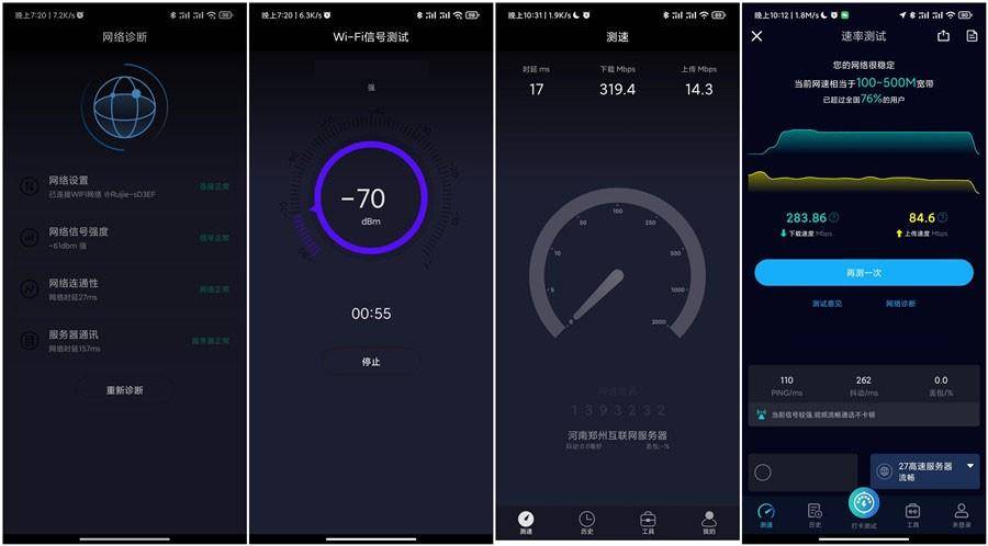 最后就是在家里比较偏的地方进行信号测试,这里能够看懂啊信号强度为-70dBm,相对来说就是有部影响了,但是问题不大,在测试网络速度的时候依然能够到280以上。相当于百兆光纤的水平。