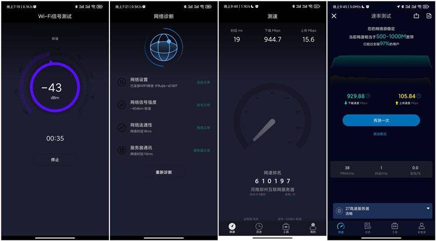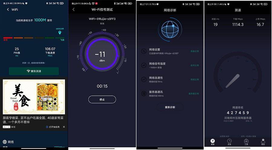 这里我首先进行了网速测试,我家里使用的是千兆带宽,这里测网速能够看到能够直接跑满家里宽带。从信号上面看能够看到这里信号达到了-11dBm信号极强。