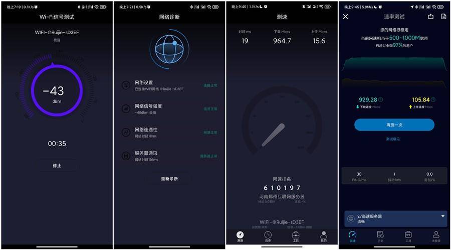 这里是隔了一堵墙的情况下,能够看到信号在-43dBm也算是极强的状态,通过测速软件能够看到当前下载速率能够达到900Mbps以上,担心测试软件不准确换了另外一款测速软件也能够达到对应速率。